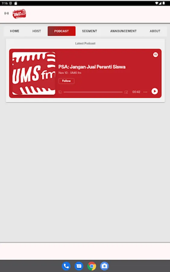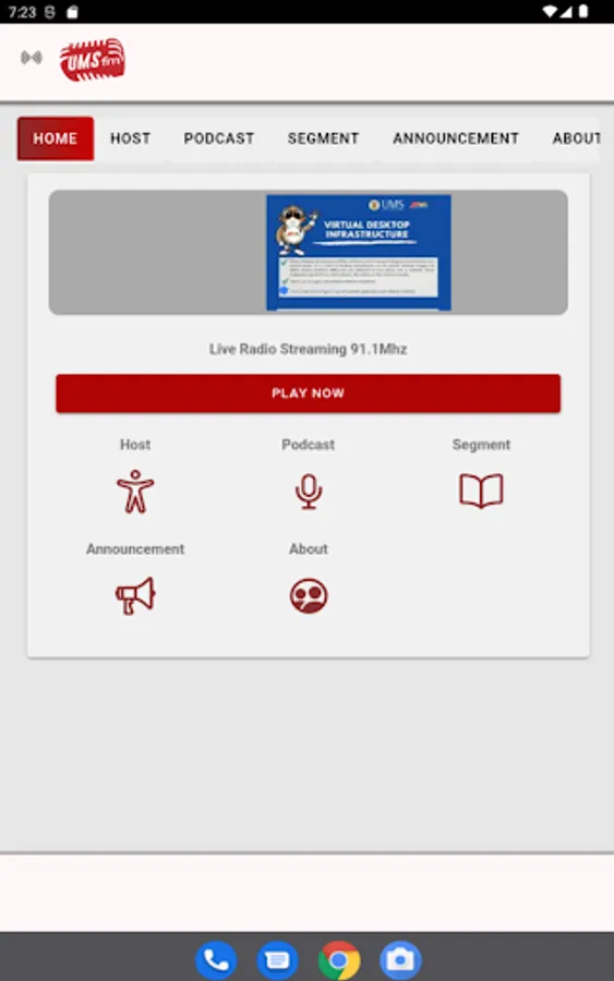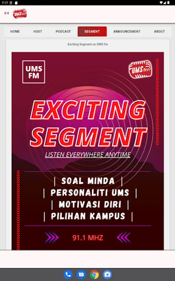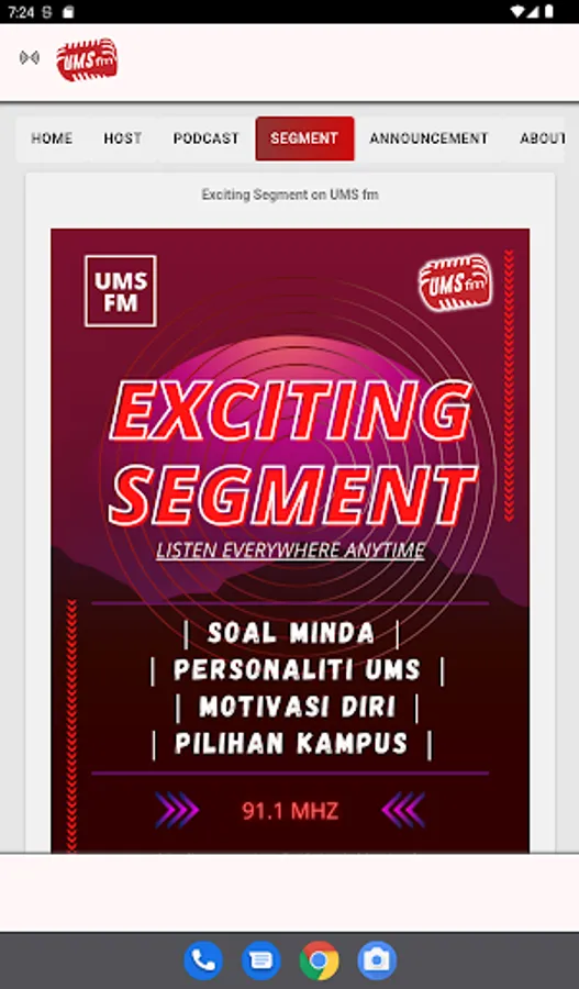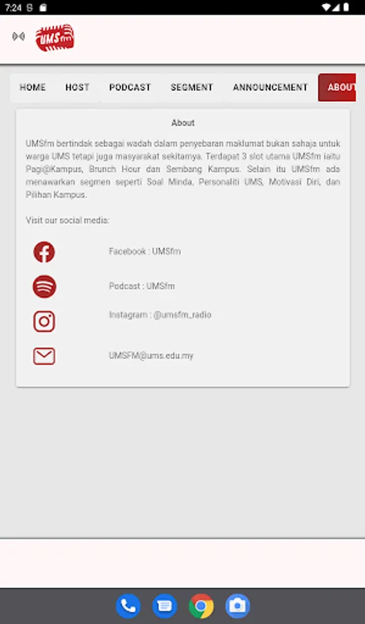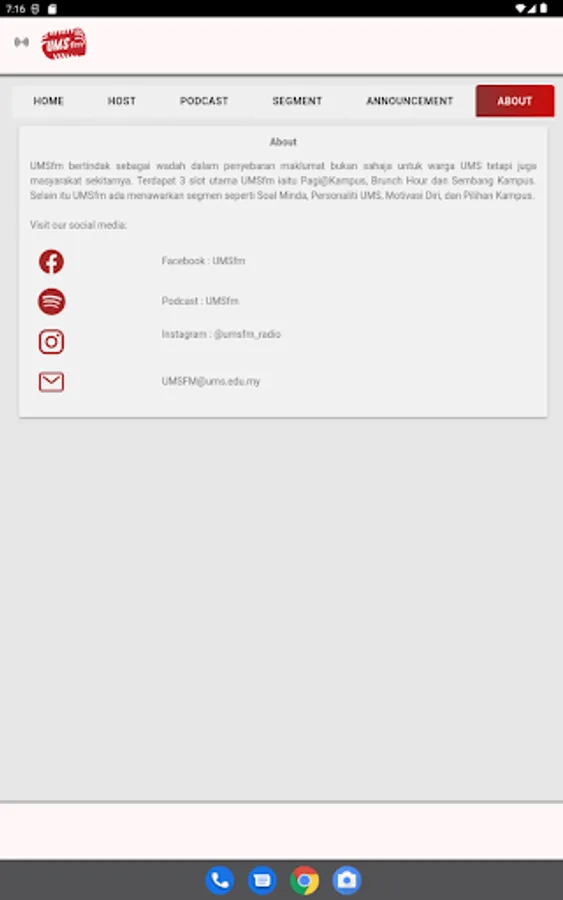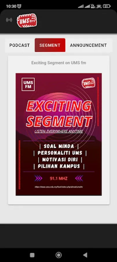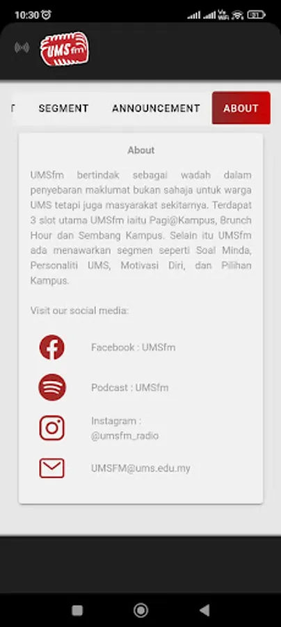 UMSfm bertindak sebagai wadah dalam penyebaran maklumat bukan sahaja untuk warga UMS tetapi jugak masyarakat sekitarnya. Terdapat 3 slot utama UMSfm iaitu Pagi@Kampus, Brunch Hour dan Sembang Kampus. Selain itu UMSfm ada menawarkan segmen seperti Soal Minda, Personaliti UMS, Motivasi Diri dan Pilihan Kampus.