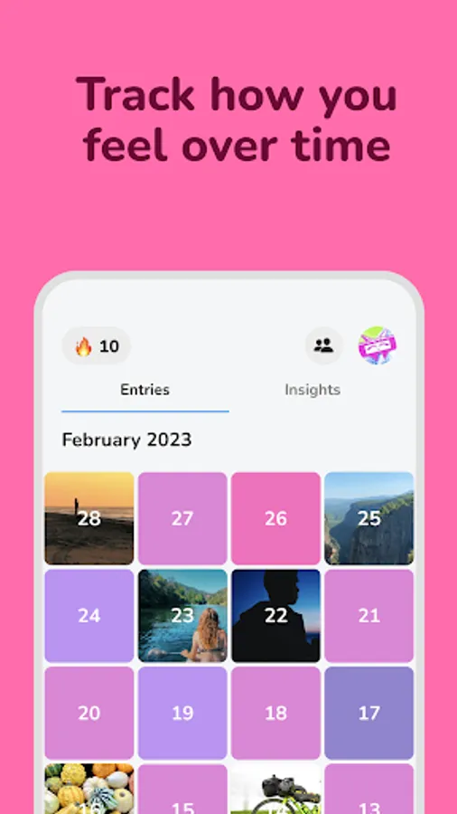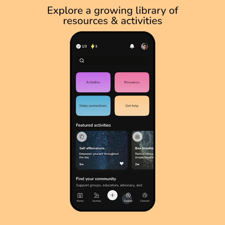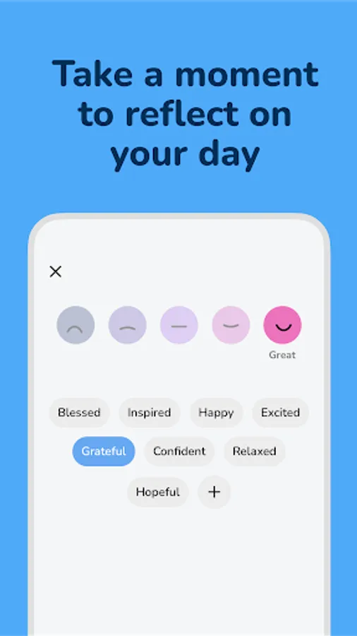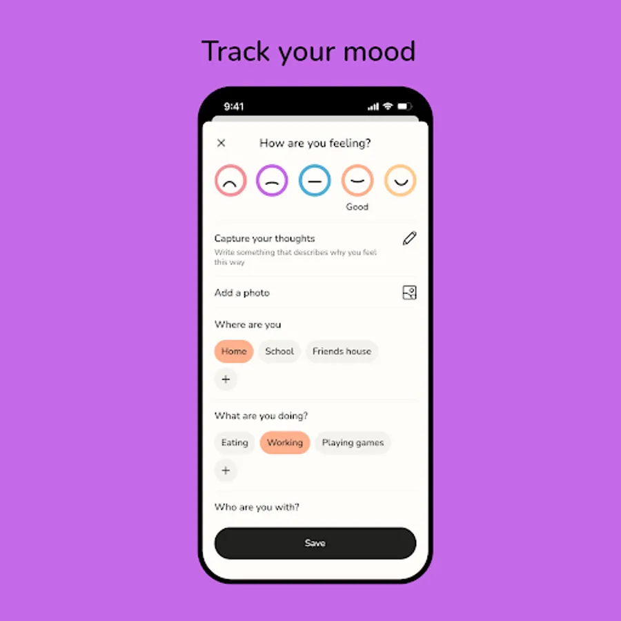 • A daily check-in so you can identify how your mood is changing over time, what is making you feel this way, and create a personal journal about what’s on your mind