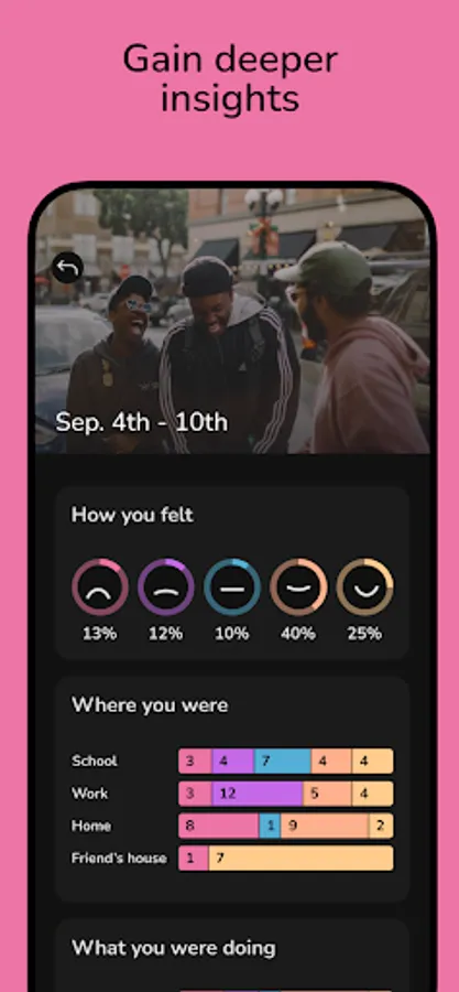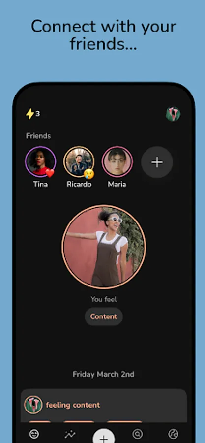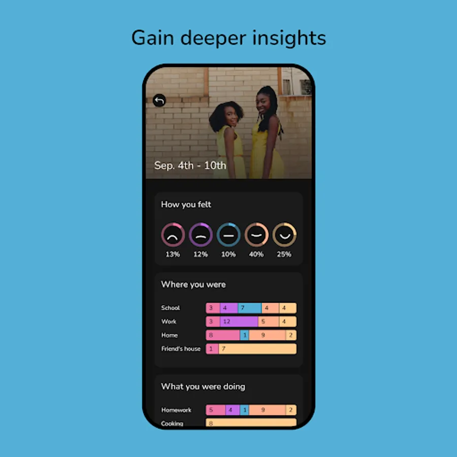 • The ability to share your mood check-in including picture with your friends so you can stay updated on how they are doing and get support from them with emojis