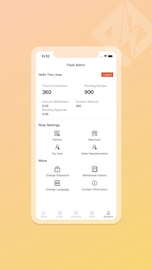 Check the rental order details, check the statistics of merchants, salesmen and agents; change passwords, withdraw cash, and switch languages;