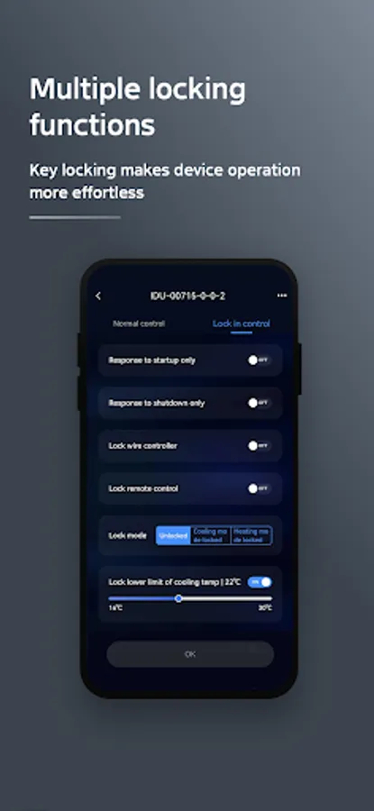 【Remote device control】: Remote control of air conditioning, including routine control and locking control of multiple parameters such as start stop, temperature, mode, wind speed, etc;