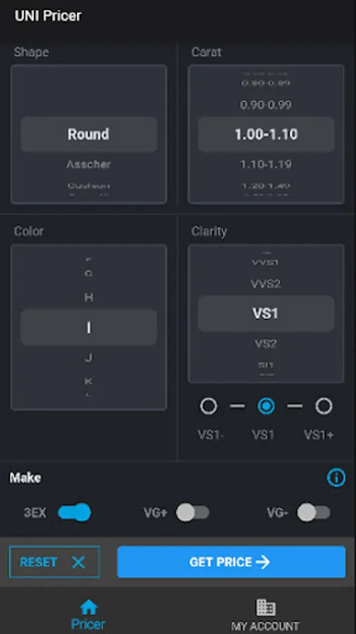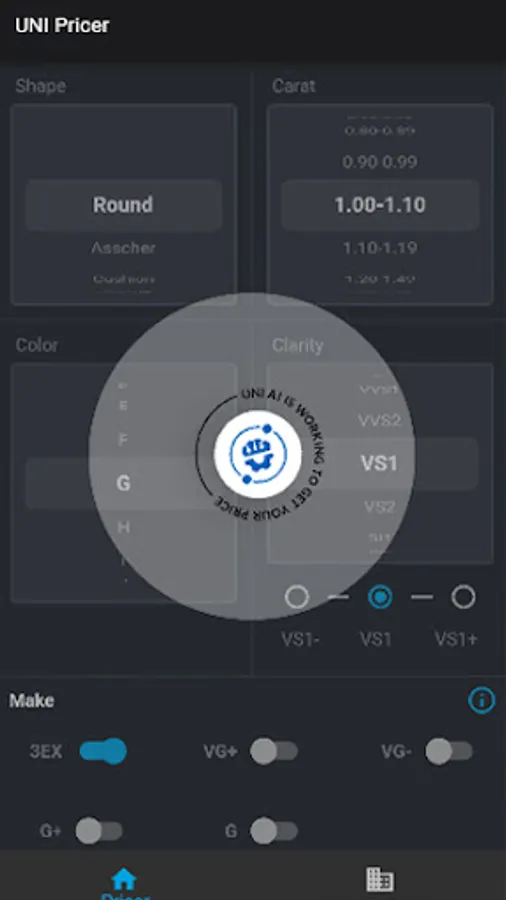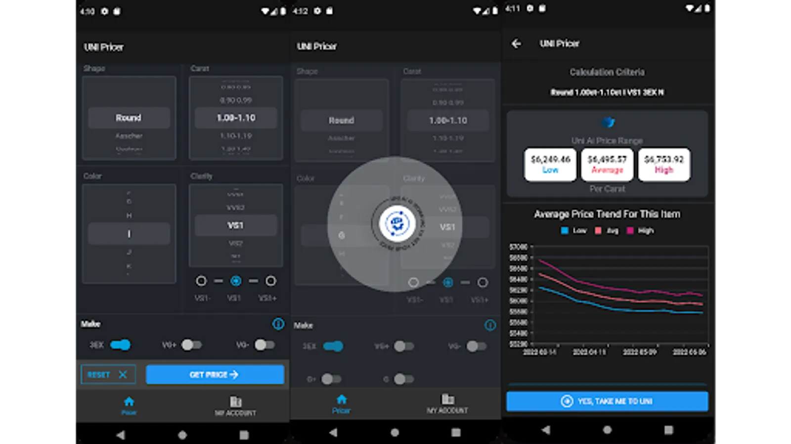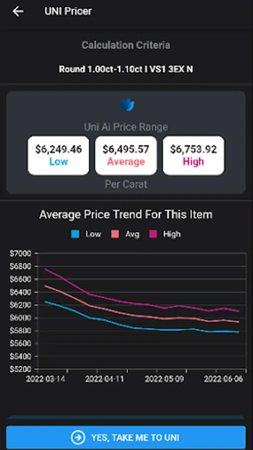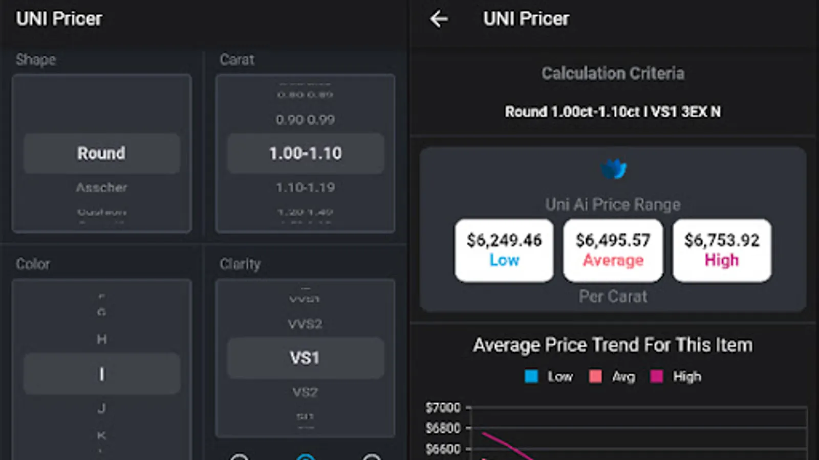 UNI Diamonds Pricer provides you with the most accurate diamond pricing information available in the market. The Pricer taps into UNI's powerful Artificial Intelligence to accurately estimate the price of a specific diamond, and also provides average, minimum and maximum price for each diamond category based on our vast inventory.