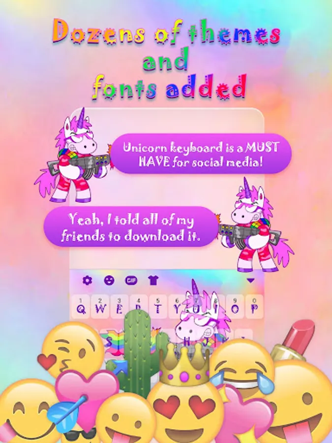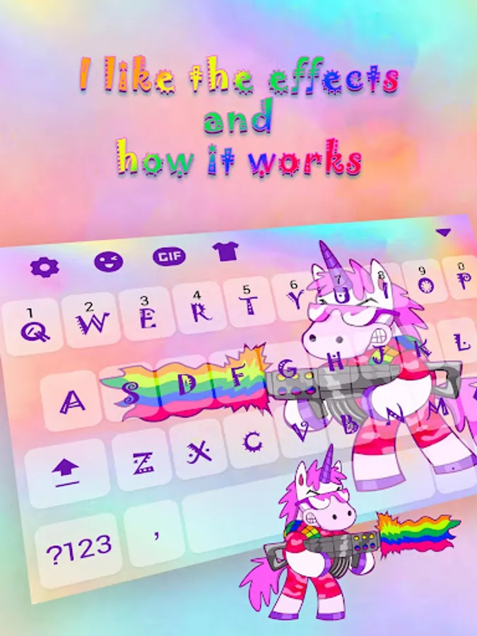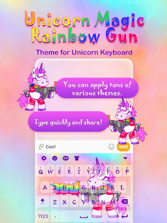 ❤ Dear girls, welcome to the world of rainbow unicorns - where magic begins! Don't miss the chance to have Unicorn Magic Rainbow Gun on your keyboard! Designed specially for all cute girls out there, this lovely "Unicorn Magic Rainbow Gun Keyboard Theme for Girls" changer will simply exceed all your expectations and will give your phone a totally new shine! Enjoy texting message like never before thanks to your new Unicorn Magic Rainbow Gun Keyboard Theme for Girls!
