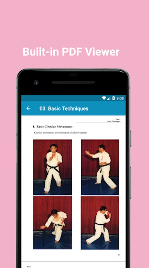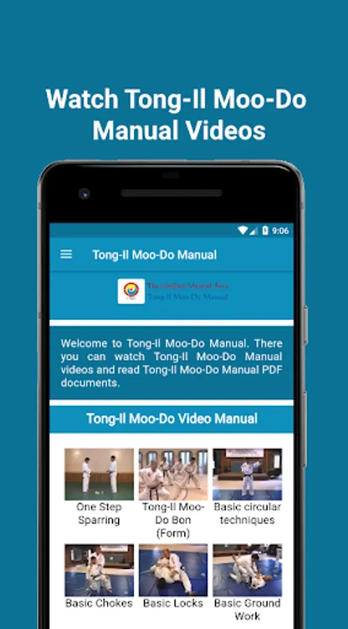 This app contains 59 Tong-Il Moo-Do Manual videos (One Step Sparring, Tong-Il Moo-Do Bon (Form), Basic circular techniques, Basic Chokes, Basic Locks and Basic Ground Work). No need internet connection (all videos are stored locally on device). If you don't need video content, you can use the similar app "Tong-Il Moo-Do Manual (PDFs)":