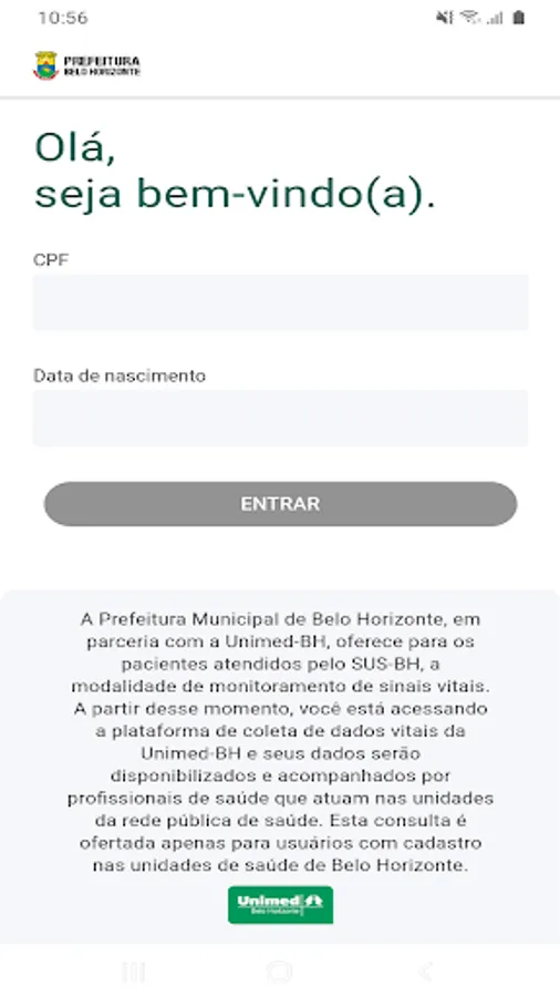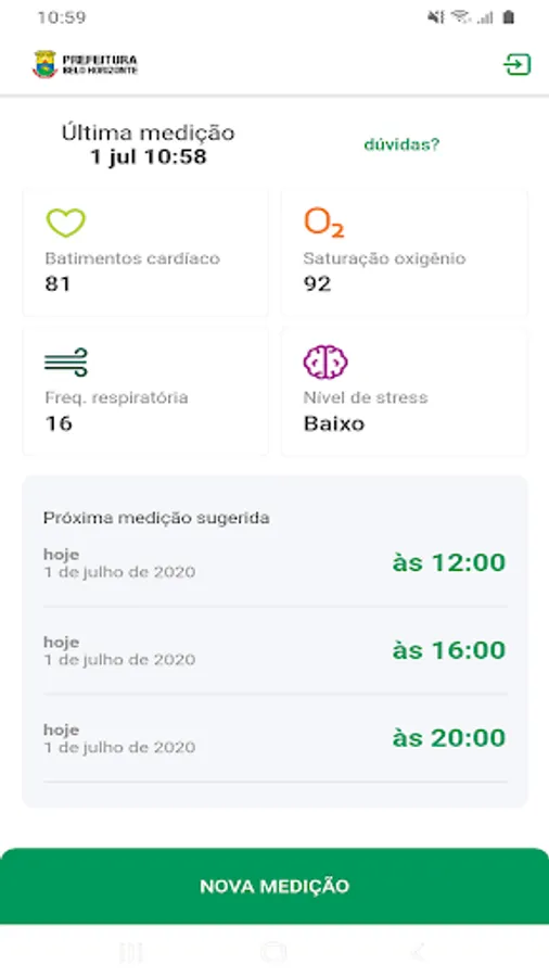 The Municipality of Belo Horizonte, in partnership with Unimed-BH, offers patients monitored by vital signs for SUS-BH patients. The monitoring application allows a patient who is being followed up with the PBH to collect his vital signs, which will then be sent to a team of health professionals to monitor and direct the case. The data collected are heart rate, respiratory rate, oxygen saturation and stress level.