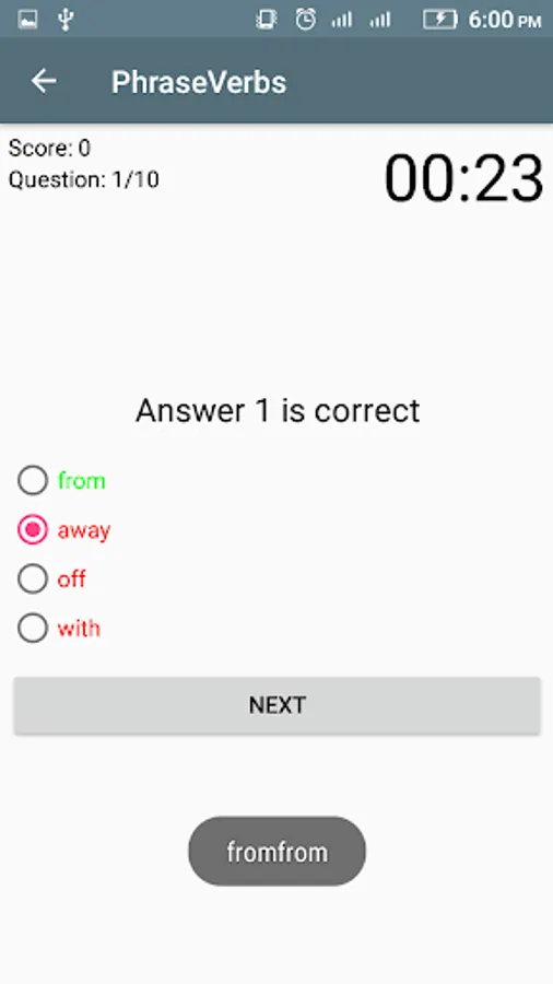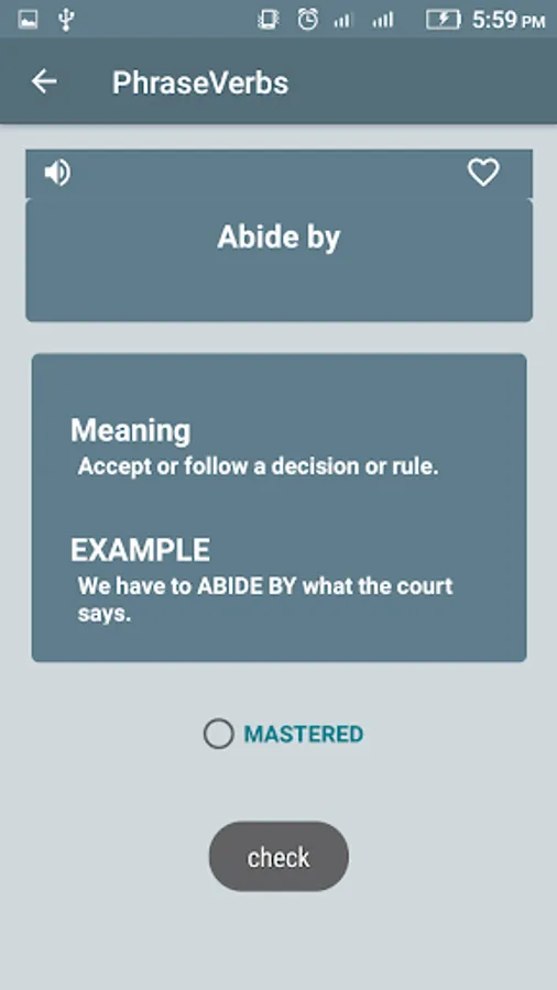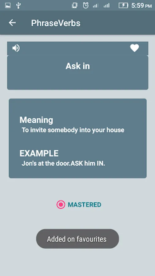 We also included quizzes in the app, which is used to test your vocabulary and usage of phrasal verb at correct sentence usage. it is based on Multiple choice questions, MCQ’s you select one of the best which you think is correct phrasal verb, and you can check is if its correct or not, the score is added to you result card on each test number, you get your score, it also included favorite words and mastered word, for you.