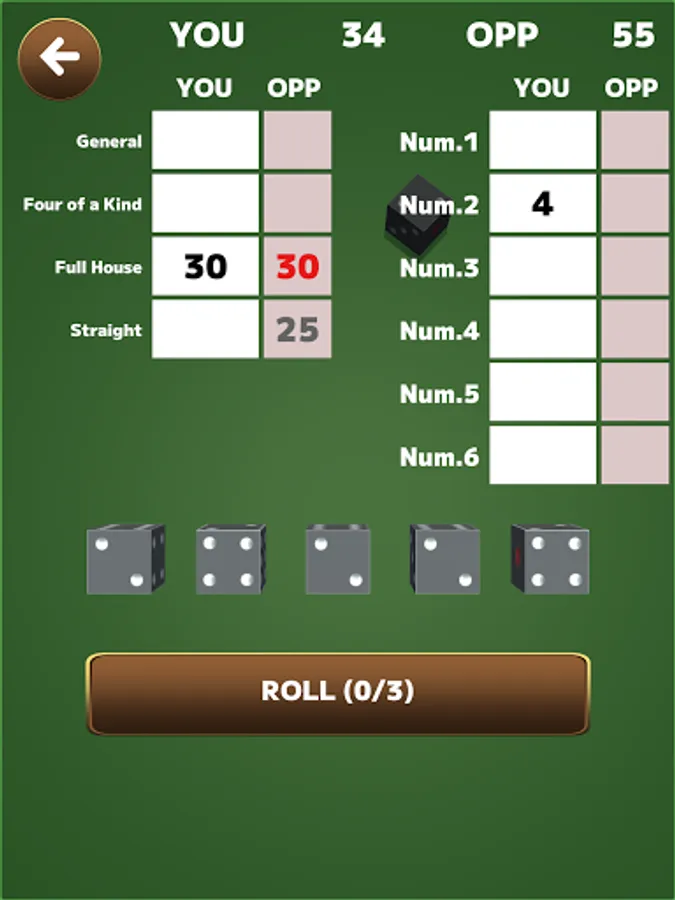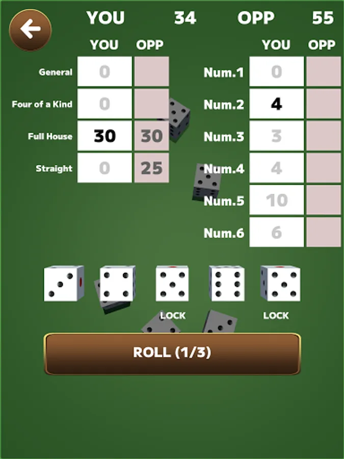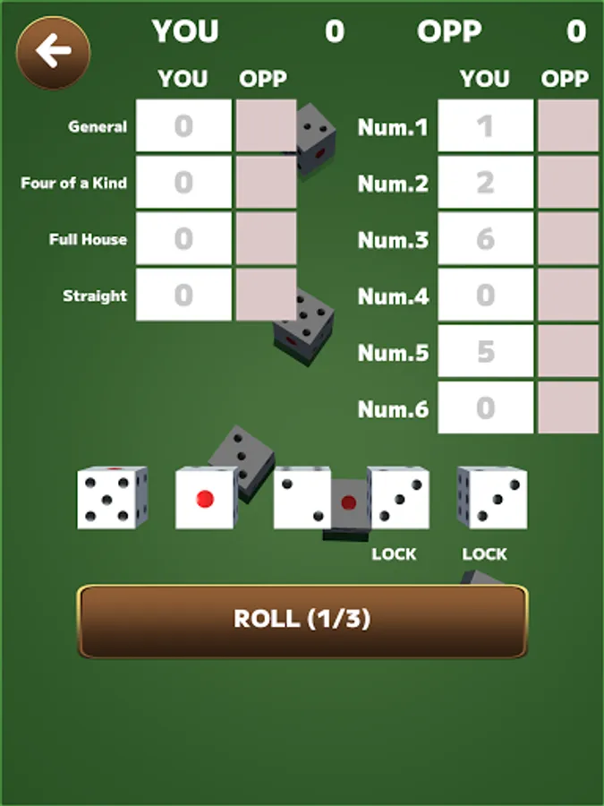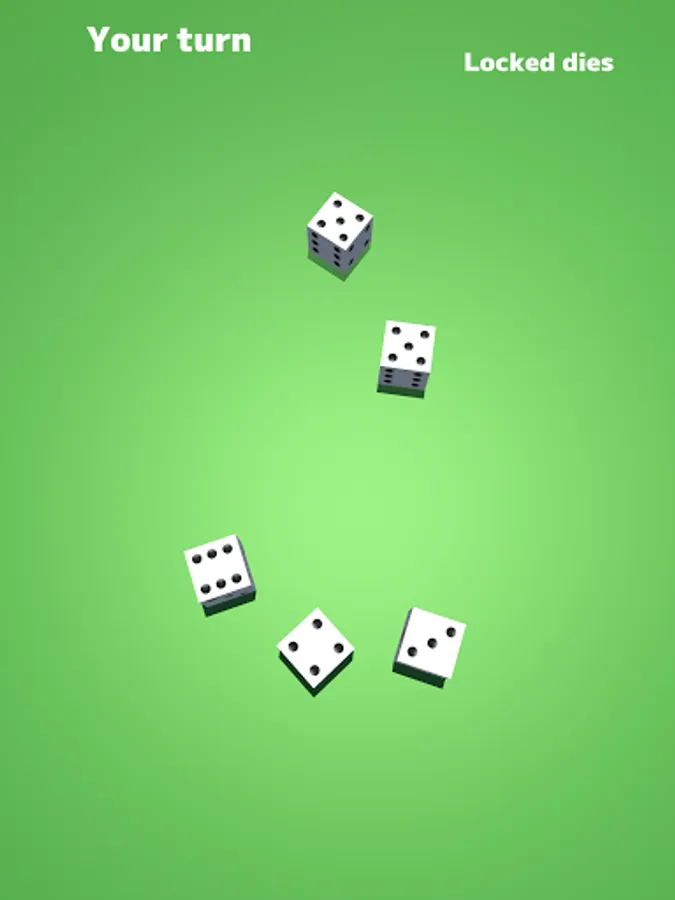 At the beginning of his turn, the player presses the "roll" button and rolls 5 dice.