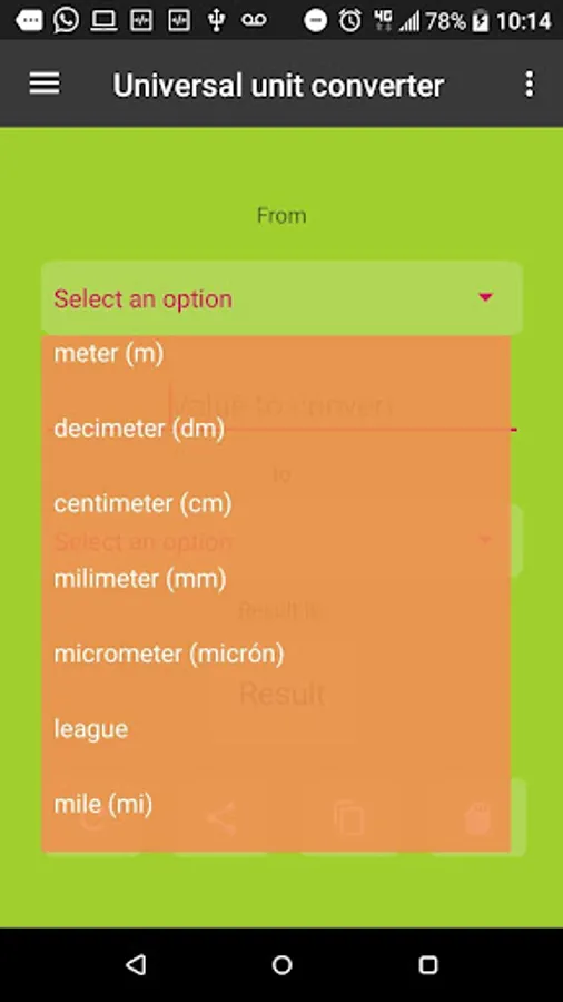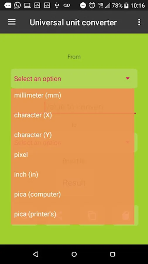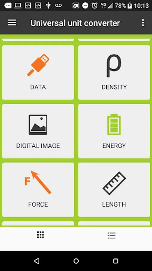Universal converter of units such as: length, energy, area, volume, solids, liquids, density, acceleration, force, speed, temperature, digital image, power, data and torque.