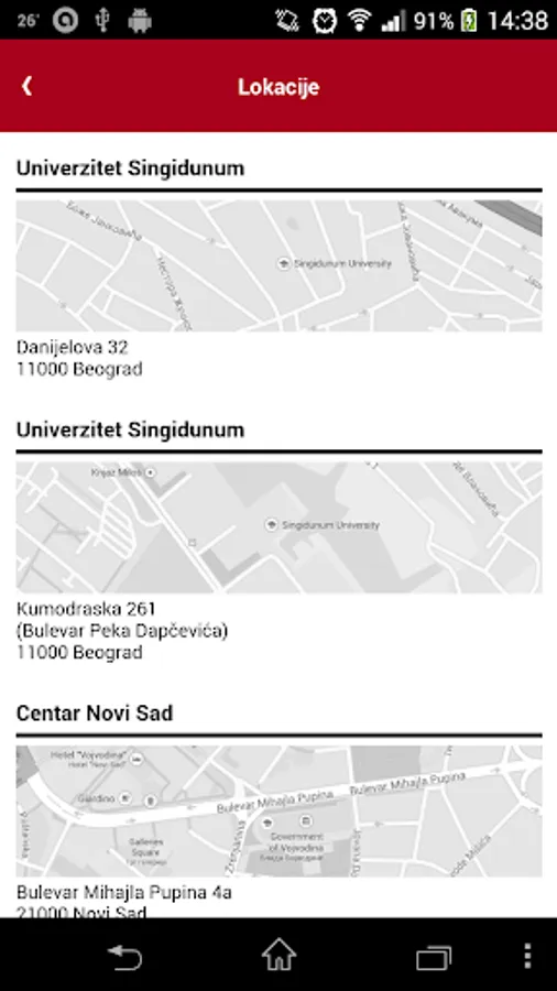 The purpose of the application is to provide access to the news from the website of the University Singidunum and websites integrated colleges. In addition to reading the news, provided assistance in finding the best path to the University Singidunum, the GPS location of the user. Applications provides an overview of the euro exchange rate for the current month and for the payment of tuition fees and so on. The application allows you to view the schedule of consultations, the schedule of lectures, display links to pages of the case, the connection with the independent application "Pages Item" to see perform & scaron; Tenja from the pages of the case, the option to contact a list of current accounts Singidunum University, and answers to frequently asked questions from the students.