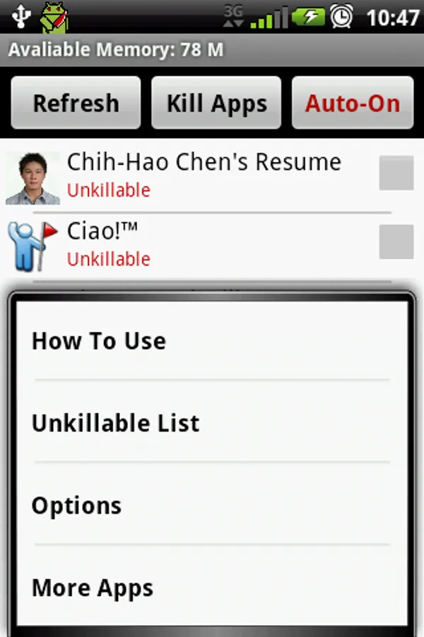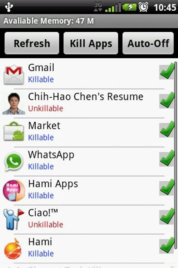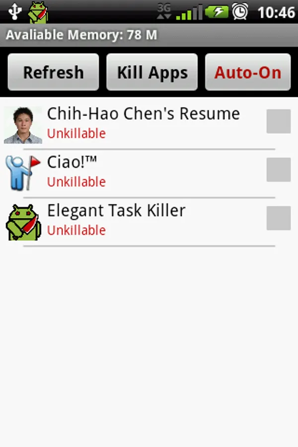 There are many types of task killer apps with various utilities on the app market, but them usually consume high CPU and memory resource by themselves. For this reason, we developed Elegant Task Killer, it is very efficient and only consume very low CPU and memory resource, I bet you will love it.