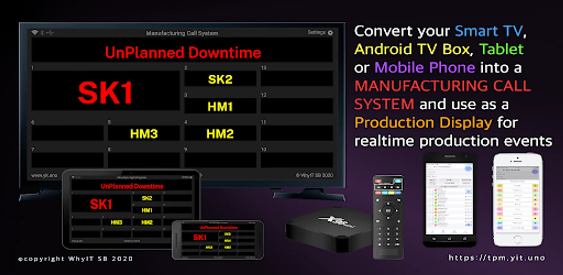 Convert your Smart TV, TV Box, Tablet or Mobile Phone into a Manufacturing Call system. Use with WhyIT TPM App as a "Production Display" to display Realtime production events like Machine Down event, Waiting For Assist event, Material Shortage etc.