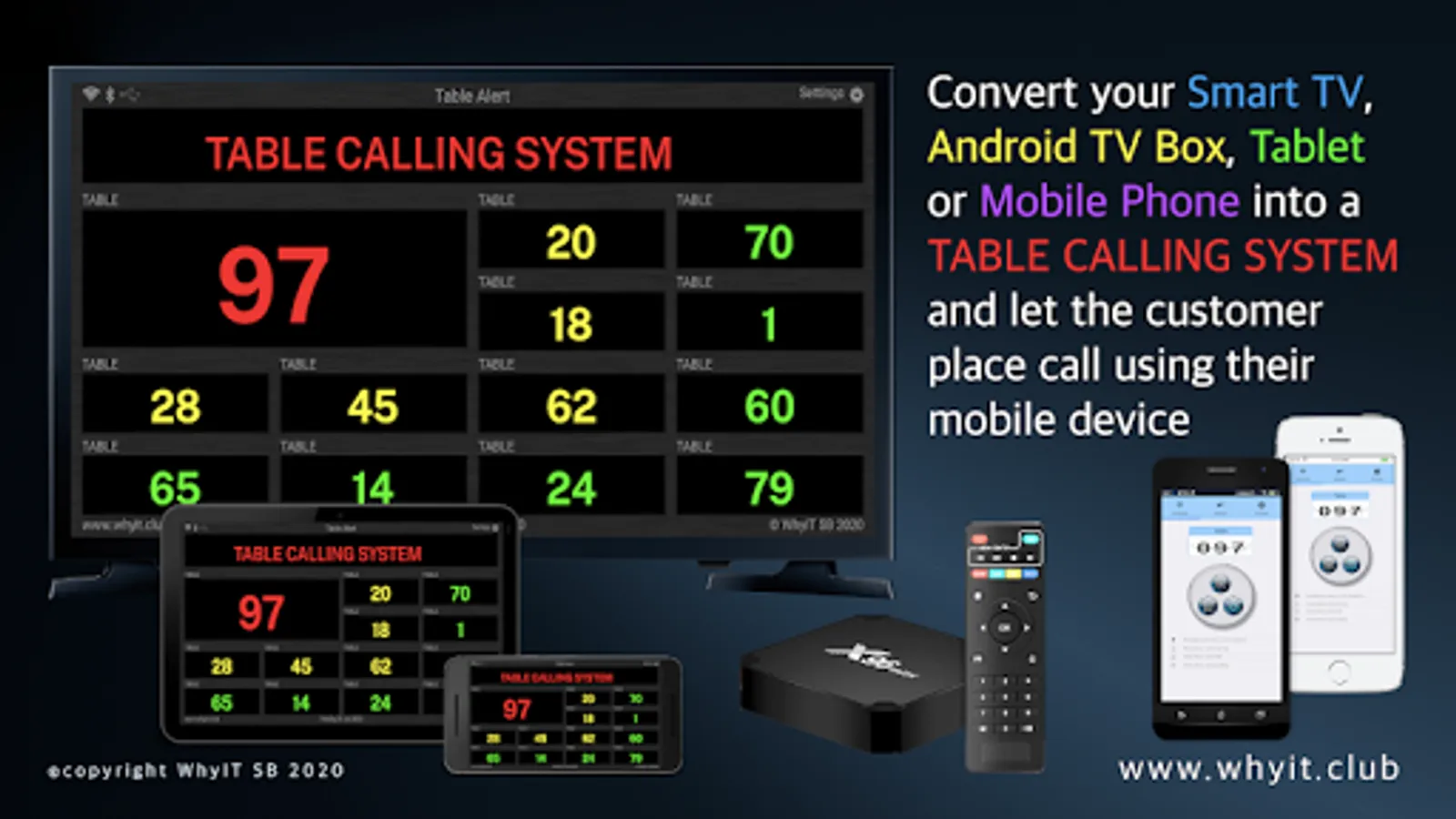 Convert your Smart TV, TV Box, Tablet or Mobile Phone into a table calling system for waiter and attendant service. Use with WhyIT HoSayoh App as "Call Button". No special hardware required, run on wireless network and bluetooth connection to place call using customer mobile devices.