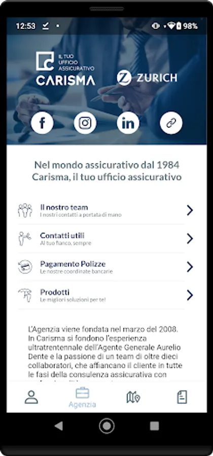 • It is the new Carisma app created to offer information on the organizational structure of the agency and the types of offers in the insurance field.