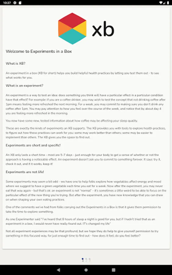 Experiments are Short and Specific: An XB only lasts a short time - most are 5-7 days - just enough for your body to get a sense of whether or not the approach is having a noticeableeffect. An experiment doesn’t ask you to commit to something forever. It says: try it; check it out, and if it works, keep it!