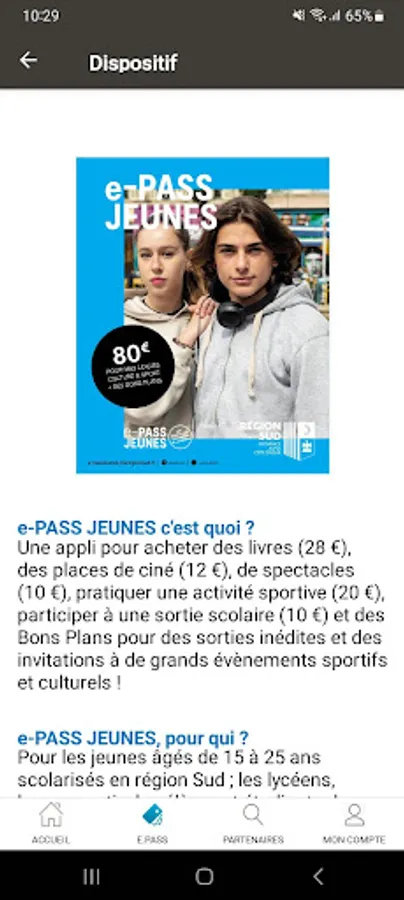 What advantages? €80 in benefits to buy books, cinema tickets, shows, practice a sporting activity and take part in a school outing with e-PASS JEUNES partners.