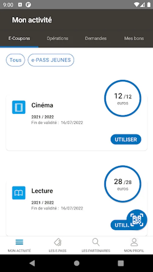 The partner area allows the partner to connect to carry out transactions by scanning the QR-Code present on the young person's mobile application, and to view the history of their transactions and reimbursements.