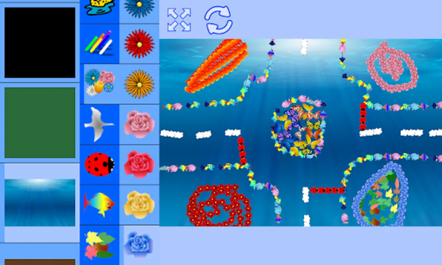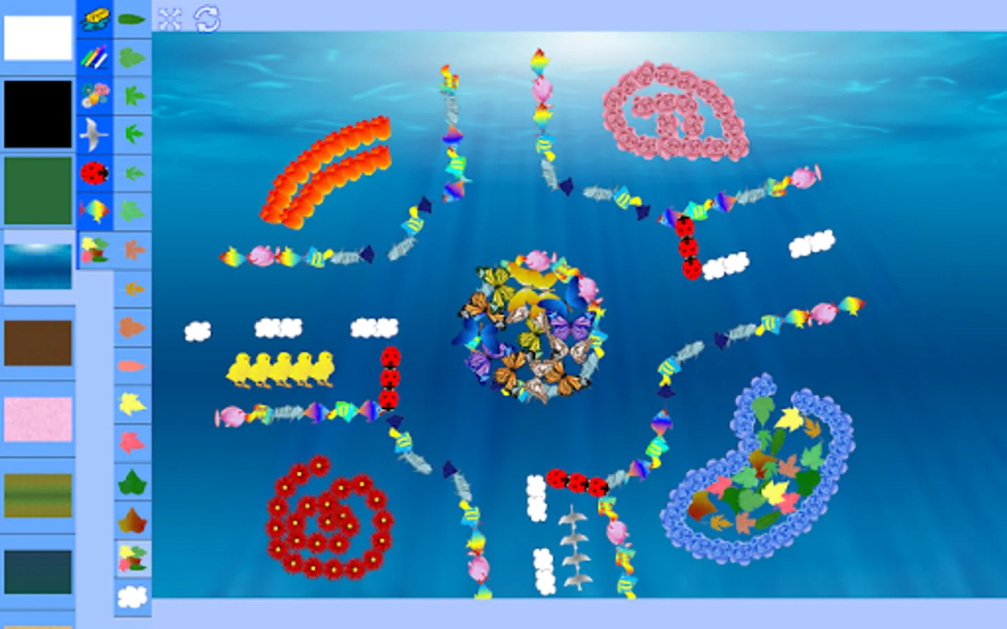 ▶ Free shapes or forms and free models: with dozens of backgrounds, the child is free to express his/her imagination by drawing with tulips, ducks, butterflies, fish, clouds, autumn leaves, etc.