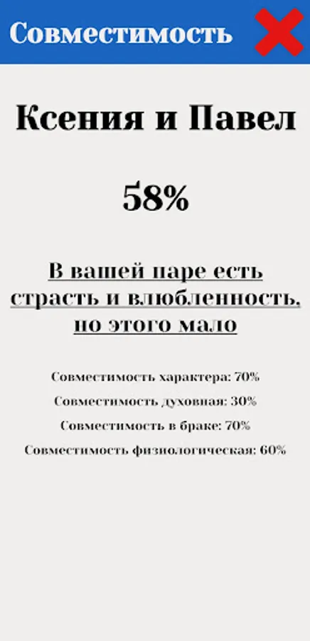 Rate the compatibility of two names with our application. Also learn the meaning of their names. Analyze the percentage of compatibility in marriage, spirituality, character and physiological compatibility. 👫