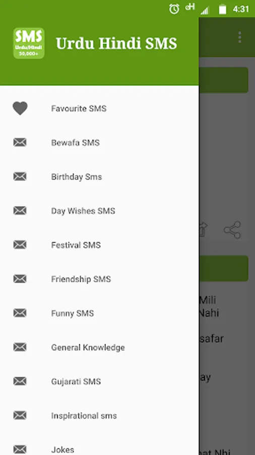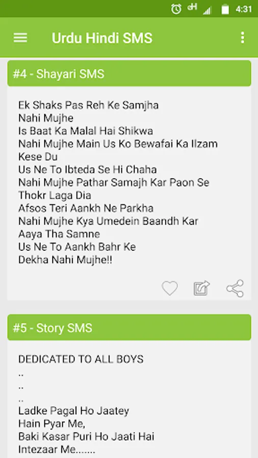 Urdu Hindi SMS application contains 50,000+ Urdu and Hindi SMS collection. It is the world's best SMS collection app. Easy to use, Beautiful graphics + Green colored theme.
