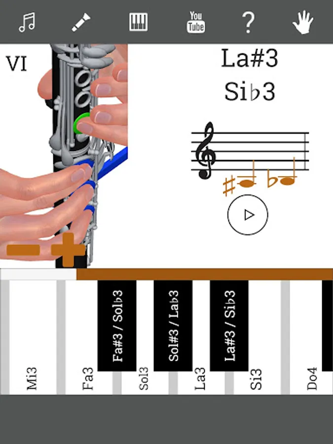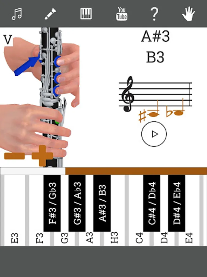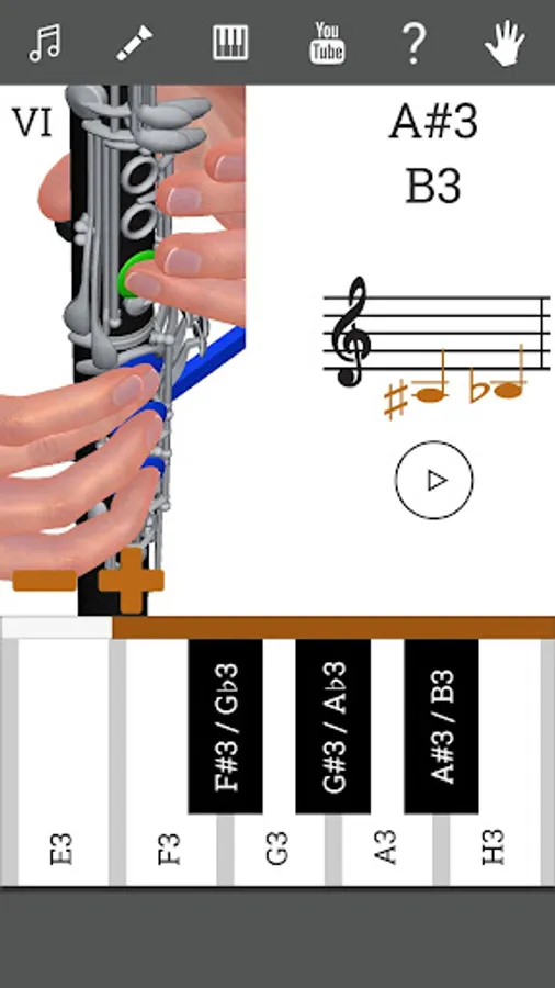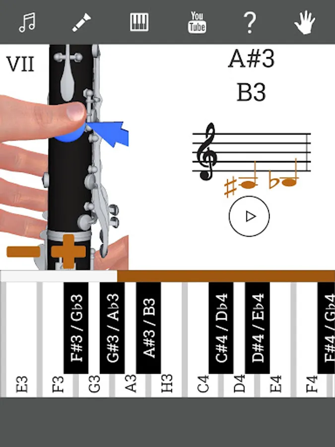 This application shows you the position of the fingers on the instrument. You can hear the sound of each musical note. There is a demonstration by 3d models, so you will learn how to play Clarinet. There is a section with clarinet lessons. You can choose different types of clarinet: C Clarinet (Soprano clarinet in C), B♭ Clarinet (Soprano clarinet in B♭), A Clarinet (Soprano clarinet in A).