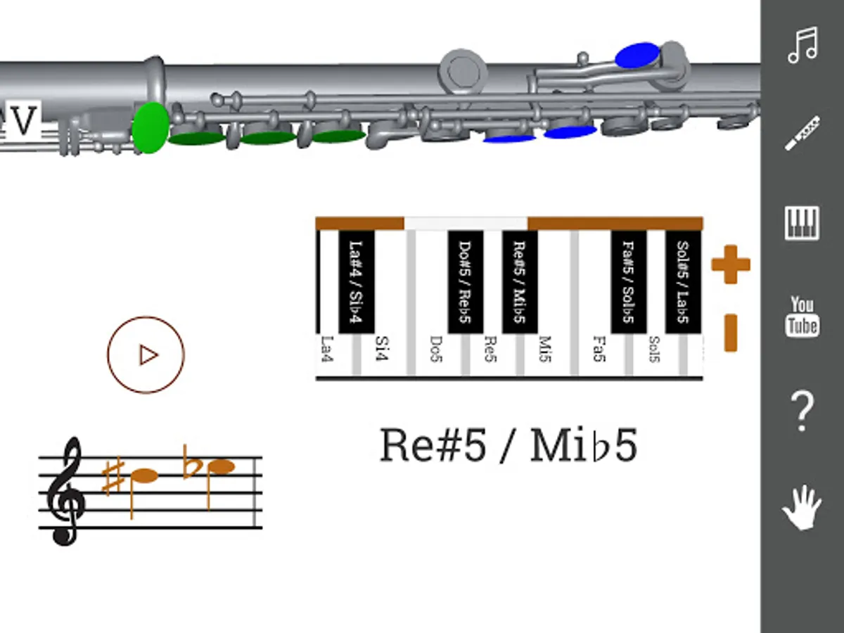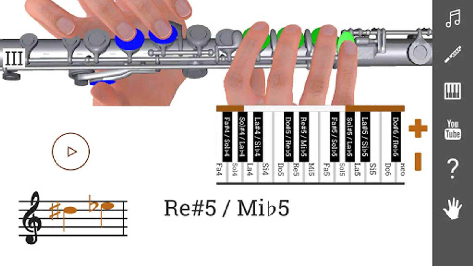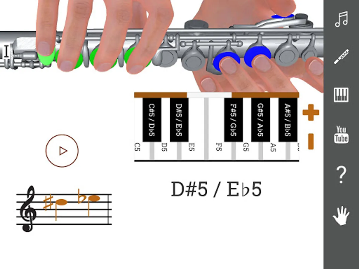 This application shows you the position of the fingers on the instrument. You can hear the sound of each musical note. There is a demonstration by 3d models, so you will learn how to play the Flute. There is a section with flute lessons. You can choose different types of flute: piccolo, flute, alto flute, bass flute. Western concert flute