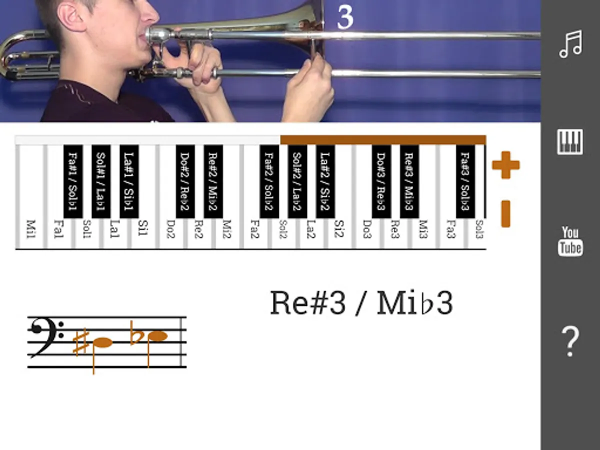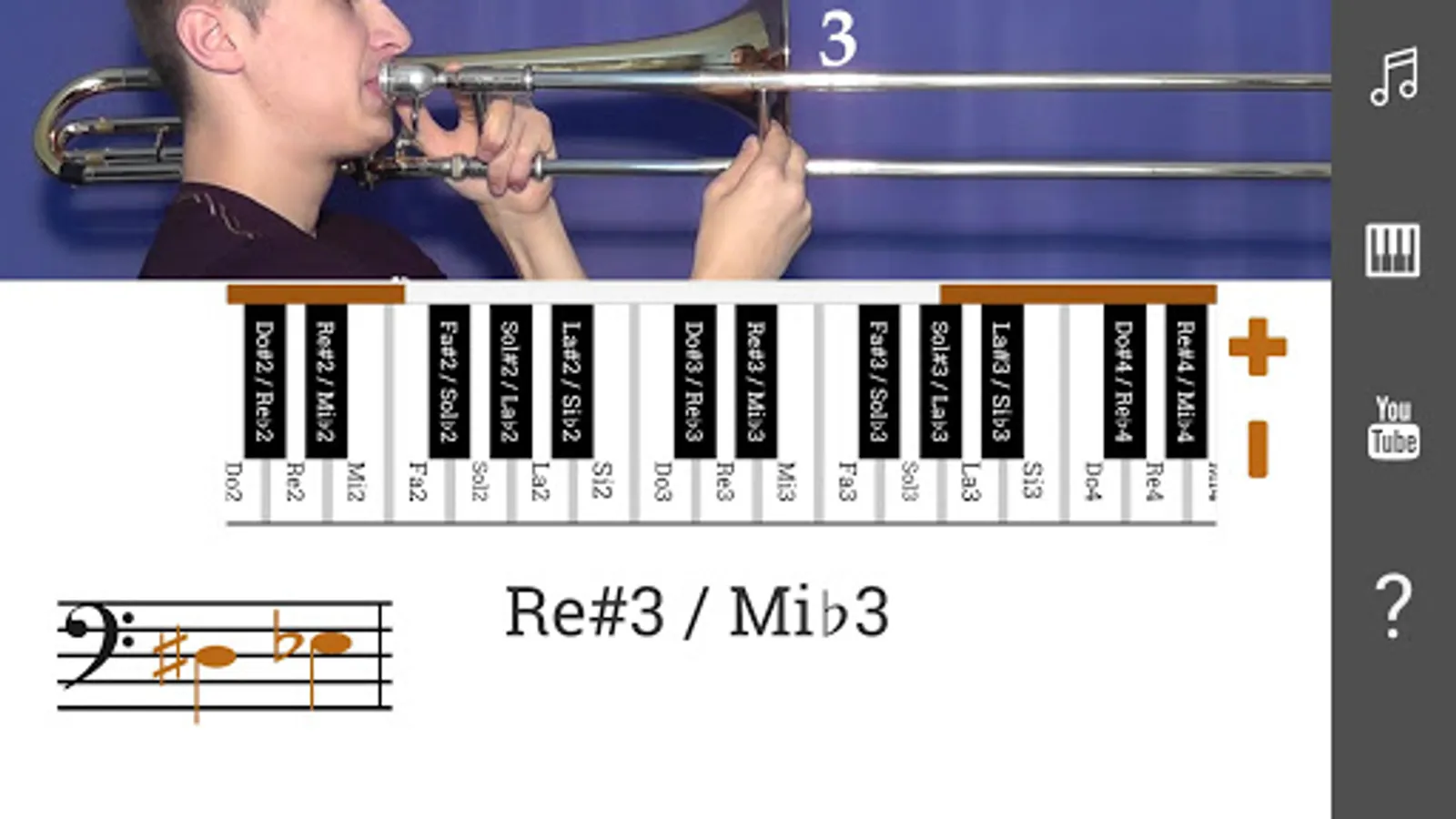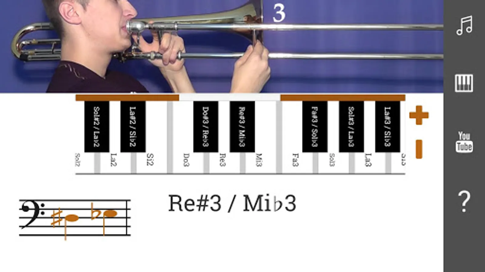 This application shows you the position of the fingers on the instrument. You can hear the sound of each musical note. There is a diagram of the finger positions and a demonstration by a live trombonist. There is a section with Tenor Trombone lessons.