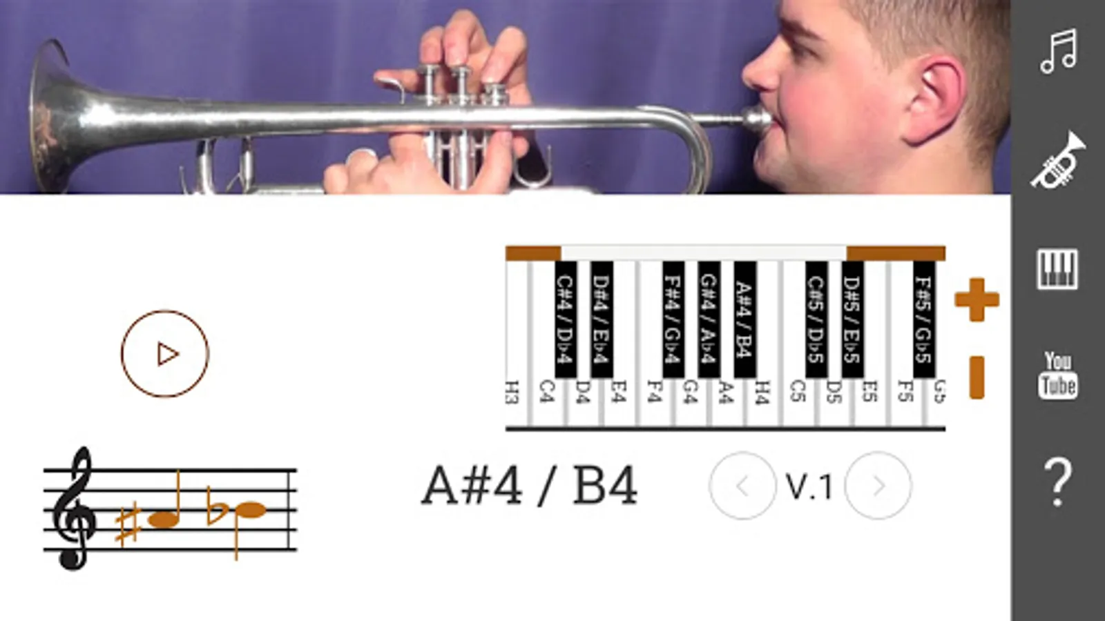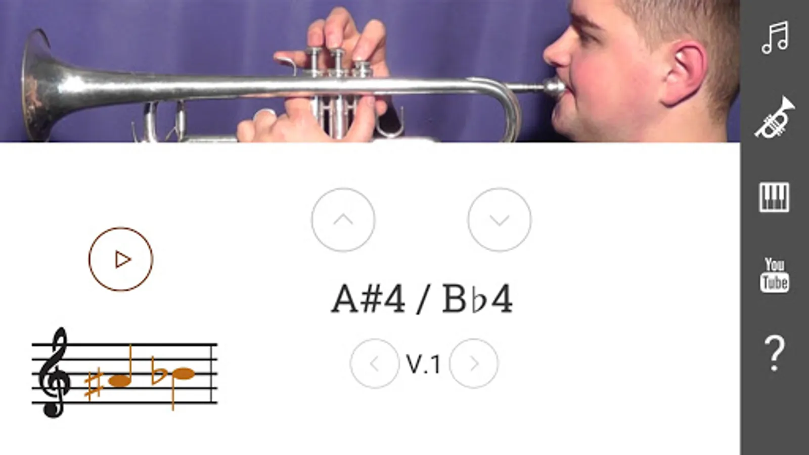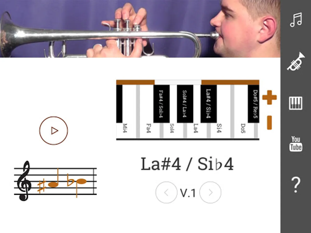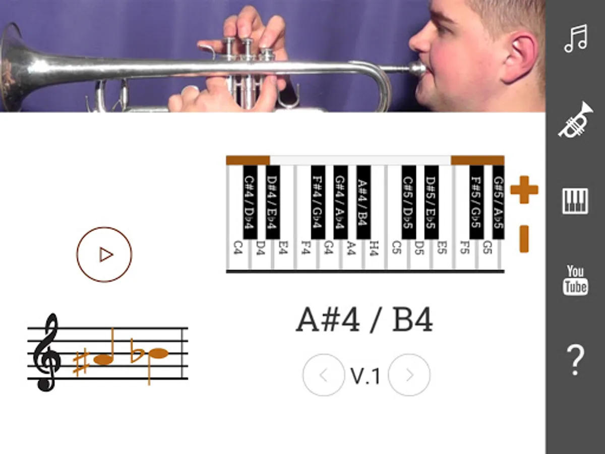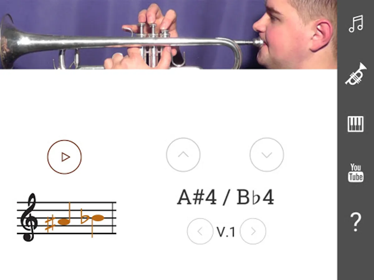 This application shows you the position of the fingers on the instrument. You can hear the sound of each musical note. There is demonstration by a live trumpet player. There is a section with trumpet lessons. You can choose different types of trumpet: Trumpet B♭, Trumpet C