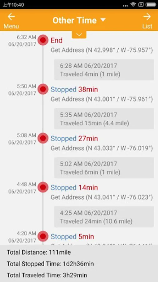 * Trip Timeline: Single summary of a specific time frame showing start and end locations, stop locations and durations, total distance traveled, specific time frames etc