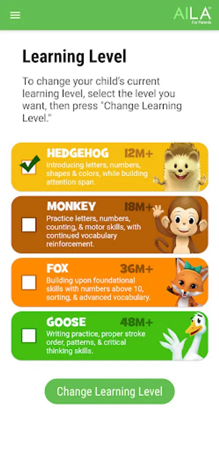 Set your child’s learning level, start and stop learning sessions, rate and review learning sessions, and monitor screen time.