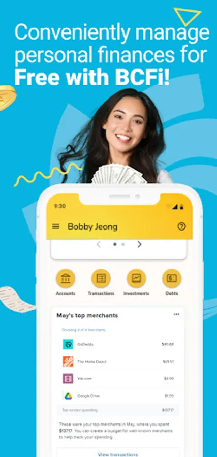 The BCFi app provides a comprehensive and easy-to-digest picture of your personal and business finances. In connecting to all relevant financial institutions, BCFi is able to aggregate all of your financial information in order to offer key insights in such areas as Spending, Investments, Transactions, Debts, Cash Flow, and Net Worth. BCFi also highlights financial Goals, tracks Budgets, and identifies key Trends.
