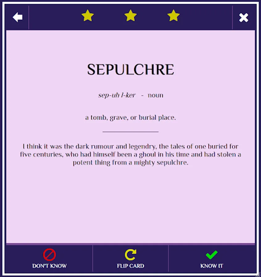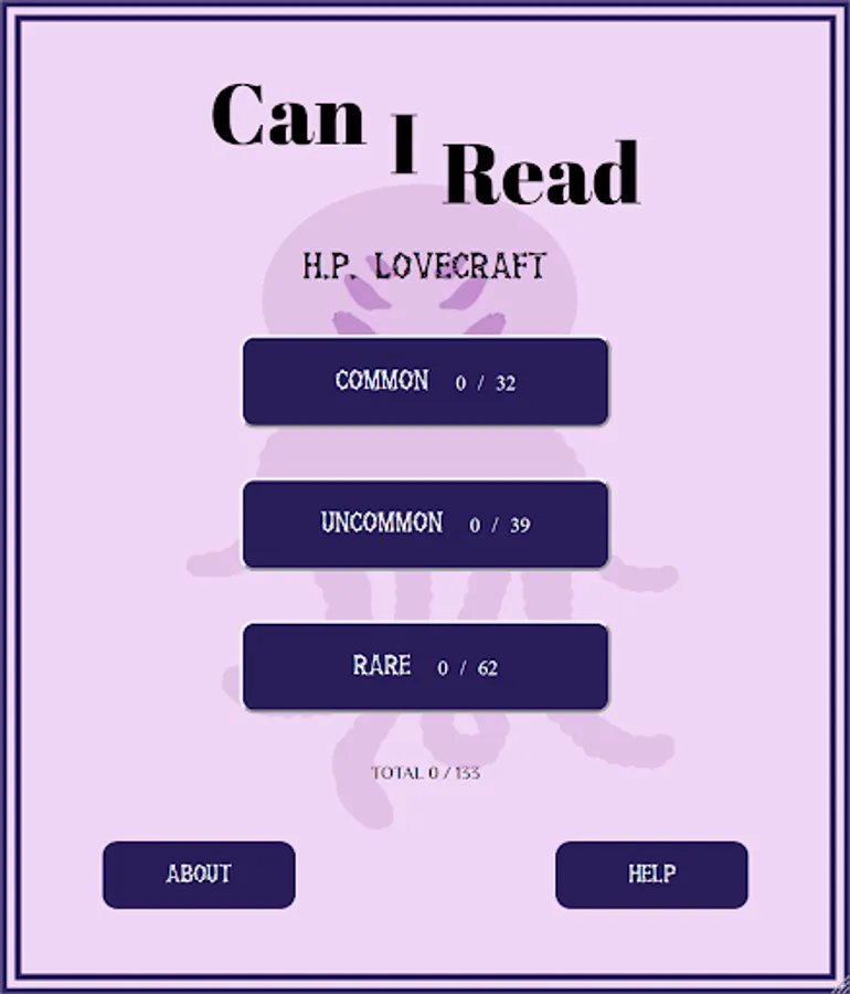 Flashcards containing vocabulary used by H.P. Lovecraft throughout his short stories and novels. While reading authors with extensive vocabularies it is common to stop in order to look up an unknown word. Some authors, such as H.P. Lovecraft, have such a large vocabulary that it is necessary to interrupt yourself so often that you lose focus and the story becomes less colorful. Using this app you will be able to master his most common but difficult words to give yourself a fluid reading experience.