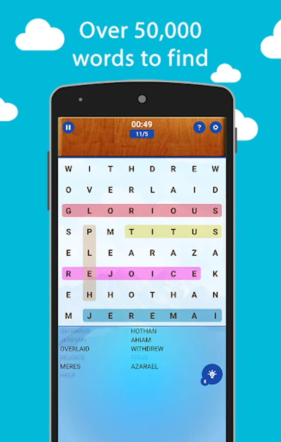 Bible Word Search! 50,000+ Bible Words in 14 languages. Find Biblical words and beat others high scores on the leader-boards.