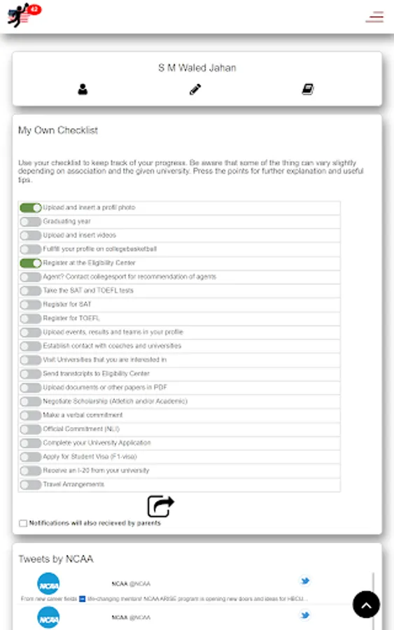 It is possible for the coach to setup criteria such as eg max hcp, lowest SAT score, lowest TOEFL score and rankings from the WAGR and EGR ranking for collegeBasketball sophisticated notification systems. If a student athlete inside those criteria is visiting the coach’s college or profile, the registered coach will be notified via the app. In this way the coach will be able to filter the perfect athlete for their program and do not need to travel the world. The athlete suited for their program will come to them.