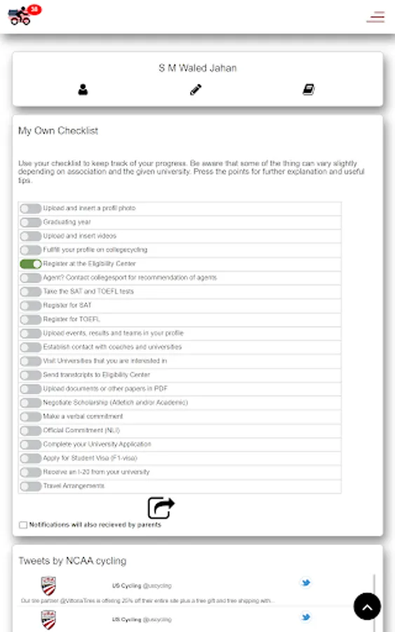 It is possible for the coach to setup criteria such as eg max hcp, lowest SAT score, lowest TOEFL score and rankings from the WAGR and EGR ranking for collegeCycling sophisticated notification systems. If a student athlete inside those criteria is visiting the coach’s college or profile, the registered coach will be notified via the app. In this way the coach will be able to filter the perfect athlete for their program and do not need to travel the world. The athlete suited for their program will come to them.