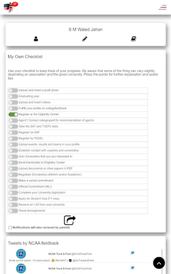 It is possible for the coach to setup criteria such as eg max hcp, lowest SAT score, lowest TOEFL score and rankings from the WAGR and EGR ranking for collegeTrack&Field sophisticated notification systems. If a student athlete inside those criteria is visiting the coach’s college or profile, the registered coach will be notified via the app. In this way the coach will be able to filter the perfect athlete for their program and do not need to travel the world. The athlete suited for their program will come to them.