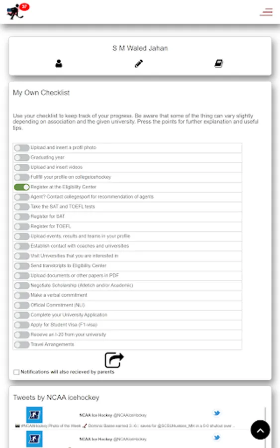 It is possible for the coach to setup criteria such as eg max hcp, lowest SAT score, lowest TOEFL score and rankings from the WAGR and EGR ranking for collegeIcehockey sophisticated notification systems. If a student athlete inside those criteria is visiting the coach’s college or profile, the registered coach will be notified via the app. In this way the coach will be able to filter the perfect athlete for their program and do not need to travel the world. The athlete suited for their program will come to them.