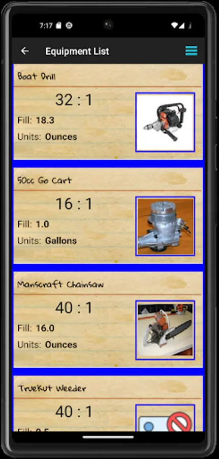 Calculates 2-stroke engine gasoline/oil mix ratios. Allows custom mix ratios. Presents database of equipment with photos for organizations with large amounts of 2-cycle tools.