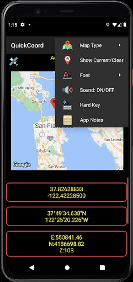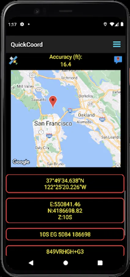 QuickCoord-LT shows your position and displays it in various precise formats. These formats include: