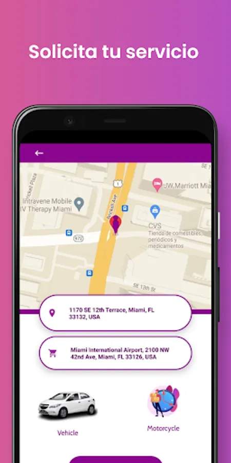 3. Selecciona el tipo de vehículo que deseas y una vez que nuestro asociado sea asignado, podrás ver su información y la del vehículo en la que te llevaran tu paquete, Podrás revisar la ubicación del conductor en tiempo real, y además, podrás contactarlo a través de mensajes desde la misma app.