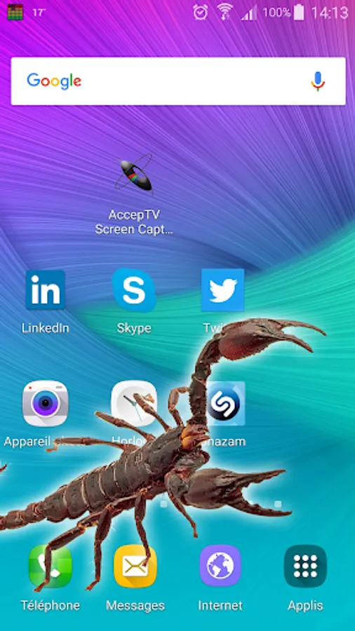 Do you want to scare a friend? Put the scorpion inside your friend's phone! This is a realistic animation of walking scorpion which is displayed in the first row on the phone screen. It can be very surprising because scorpion shows up after selected time, so you can choose when it will appear. Animation is very realistic and it can scare everyone who is afraid of arachnids.