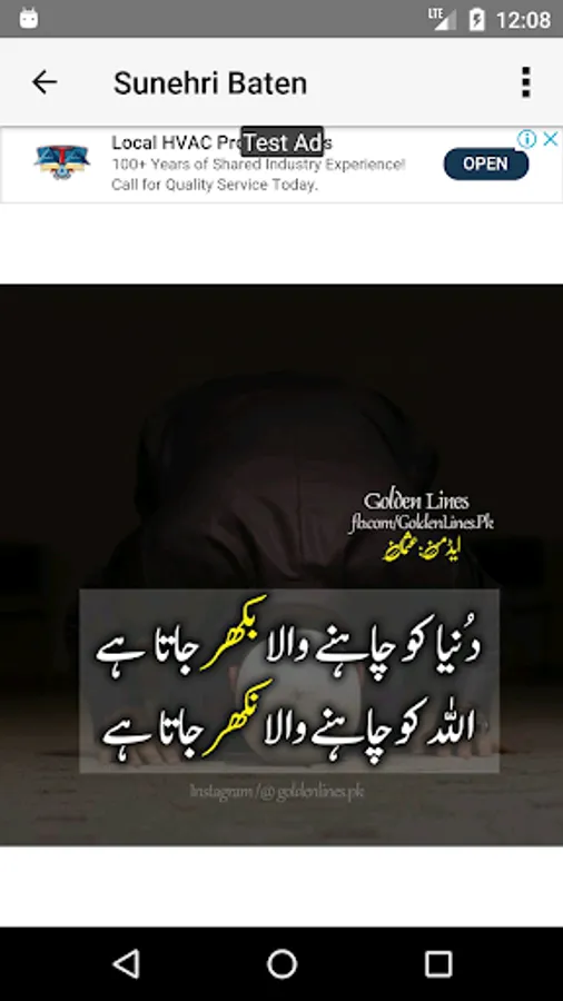 Sunehri baten Urdu app is for our urdu reading fan who can avail most well praised and searched wisdom quotes over the web. We bring you quotes and wise statements from known personalities, successors and celebrities about the various stages of life which includes their experiences and well researched key points regarding :