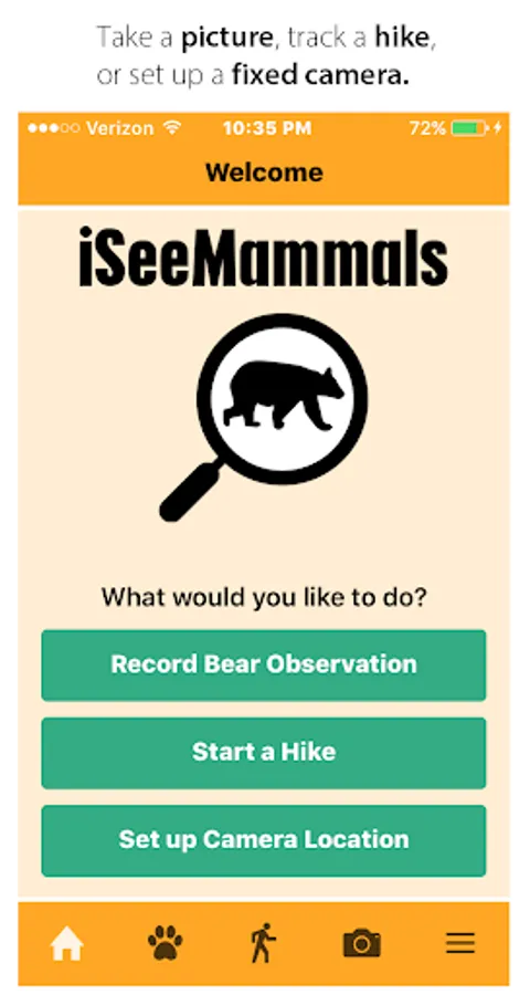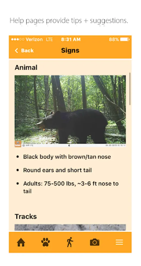 Help researchers study black bears with iSeeMammals! Use the app to 1) take photos of bears and their sign (tracks, scat, hair, and markings), 2) track a hike, and 3) set up and monitor fixed/trail cameras. Your contributions will inform bear management in New York. Help pages offer identification tips and suggestions for collecting and submitting quality data.