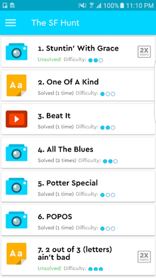 Using the mobile app, teams of 2-4 people solve riddles that lead them to unique locations around the city. At each location, teams experience something new -- they might search for a secret password, arm wrestle a stranger, or solve a riddle within a riddle. Teams submit photos, videos, or codes within the app, and can track their standings on a live leaderboard. Basically the best day ever.