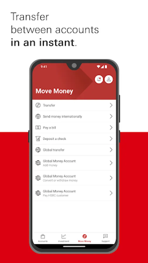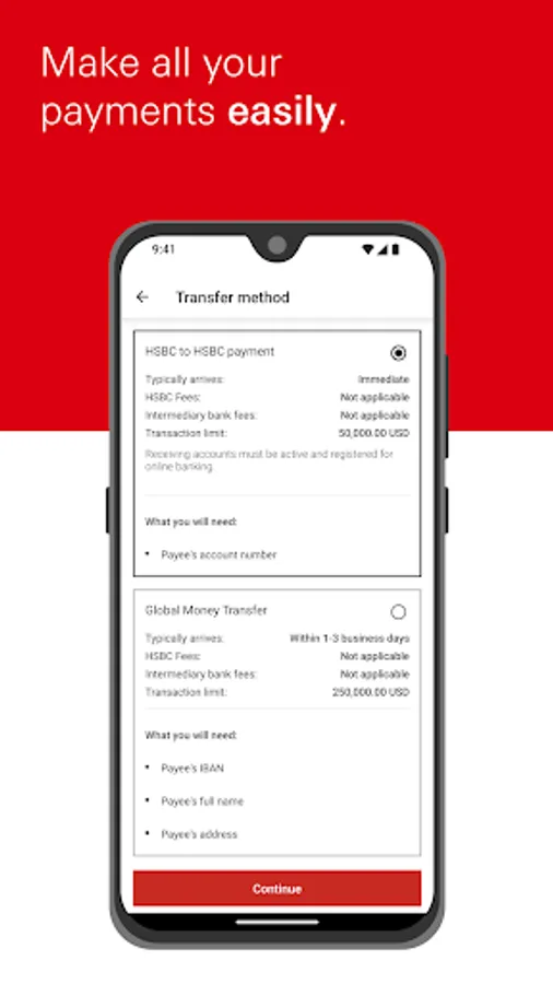 • Quickly send money in real time to eligible family, friends, and other saved payees using HSBC’s Real Time Payments (RTP®) System