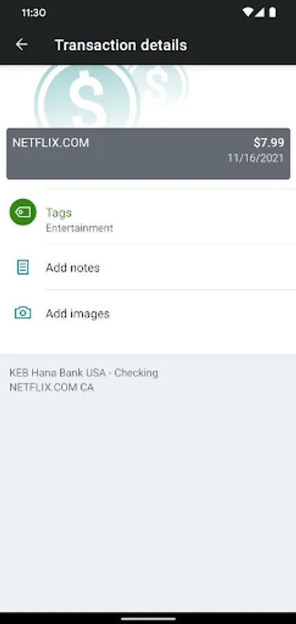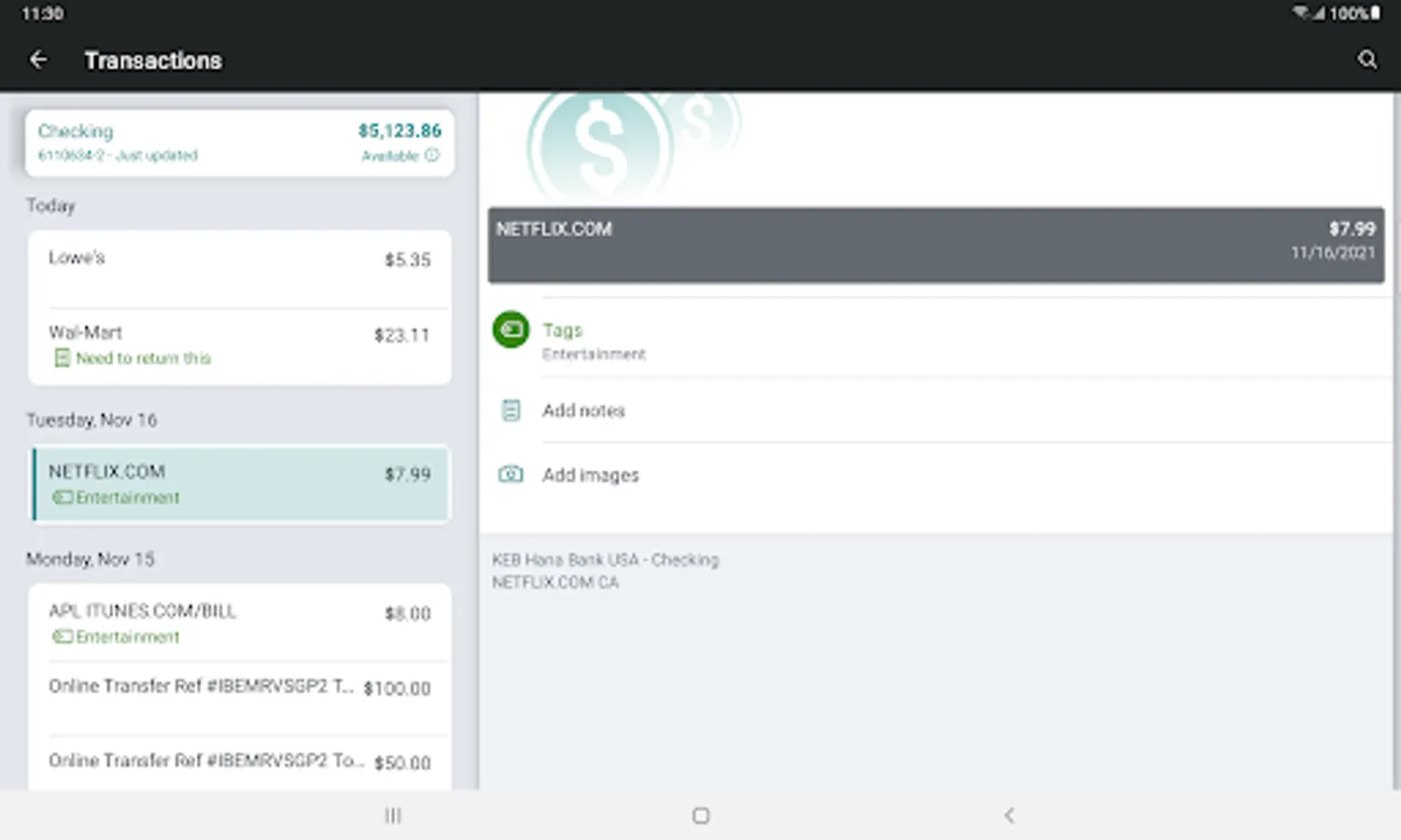 • Keep your transactions organized by adding tags, notes and photos of receipts and checks