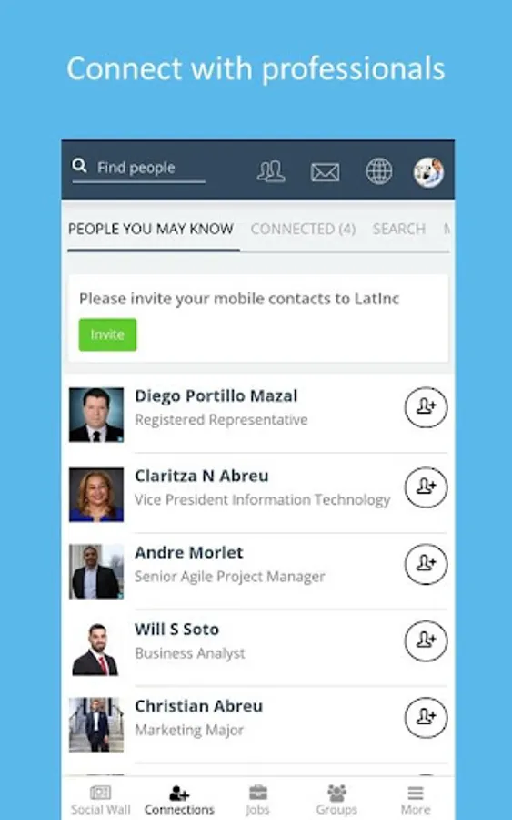 •Network with Global Latino Professionals, Students, and Entrepreneurs. It includes alumni, professionals you wish to get in touch with, entrepreneurs you admire and colleagues from your company, previous company and desired company. Collaborate, discover employment and internship opportunities, get referrals and understand industry expectations.