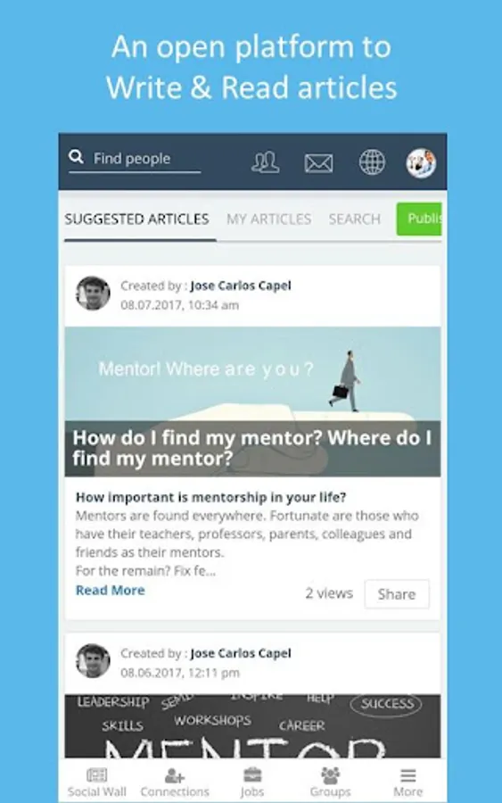 •Build your brand image and your audience. It acts as a platform to publish articles and read others’ articles. It also has a social wall where you can write posts and share knowledge