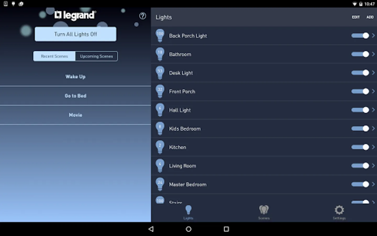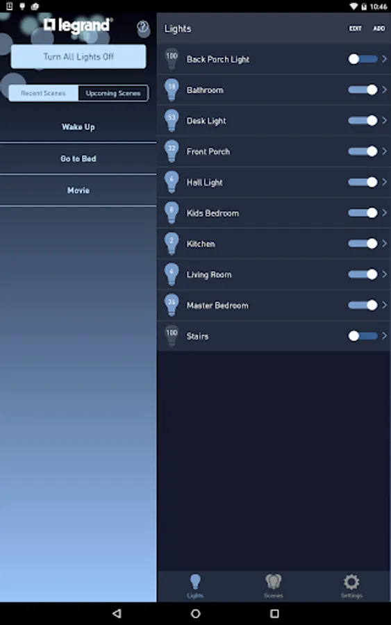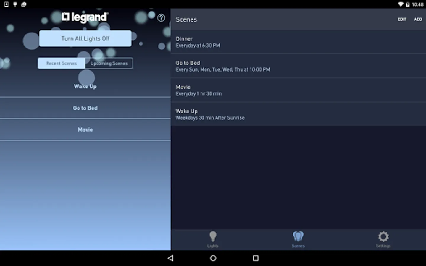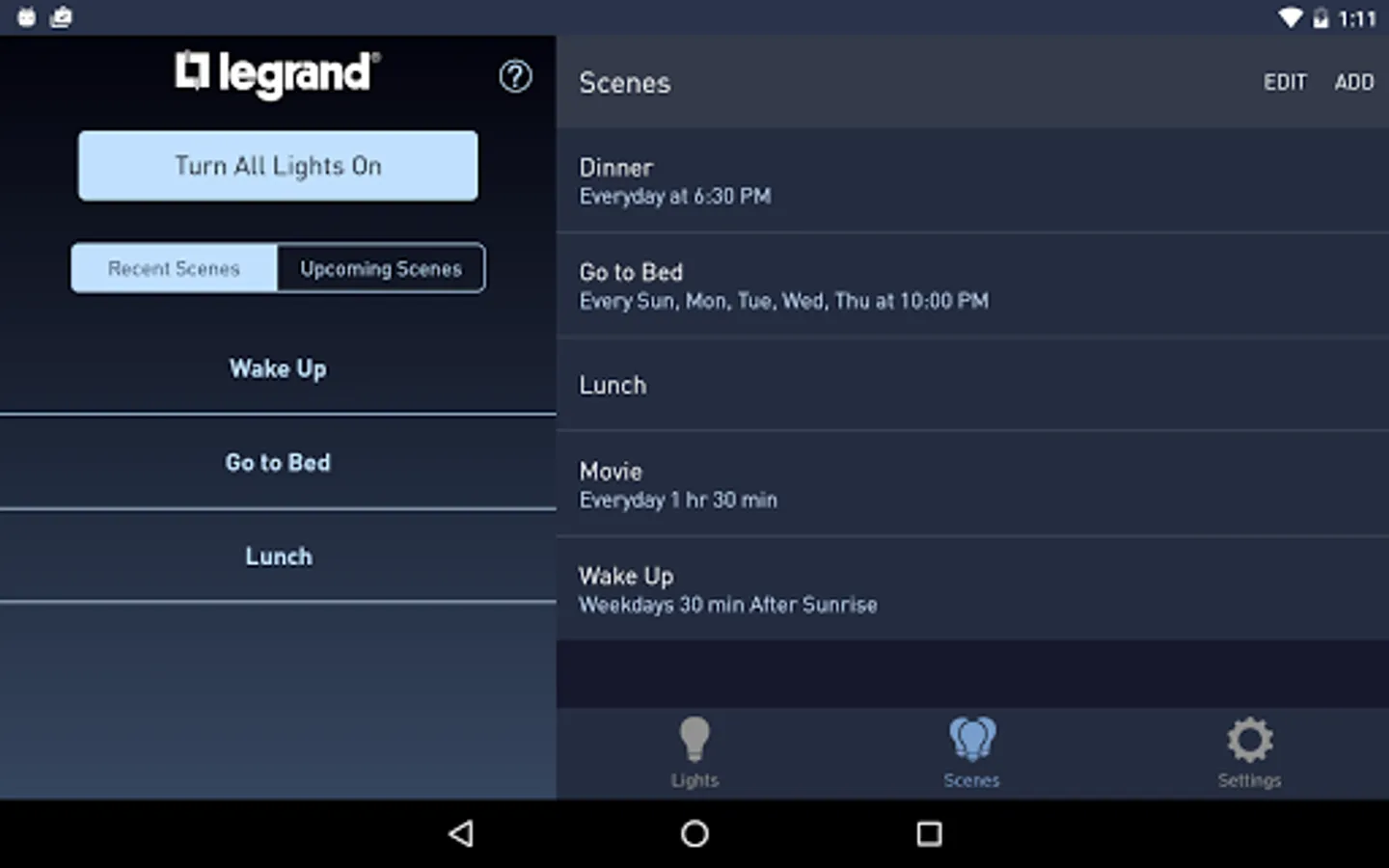 Scenes allow you to customize, schedule, and automate groups of devices to enhance the comfort and convenience of your home. Create the perfect dimming level for movie time, or automate your outdoor lights to turn on at sunset and off at sunrise.