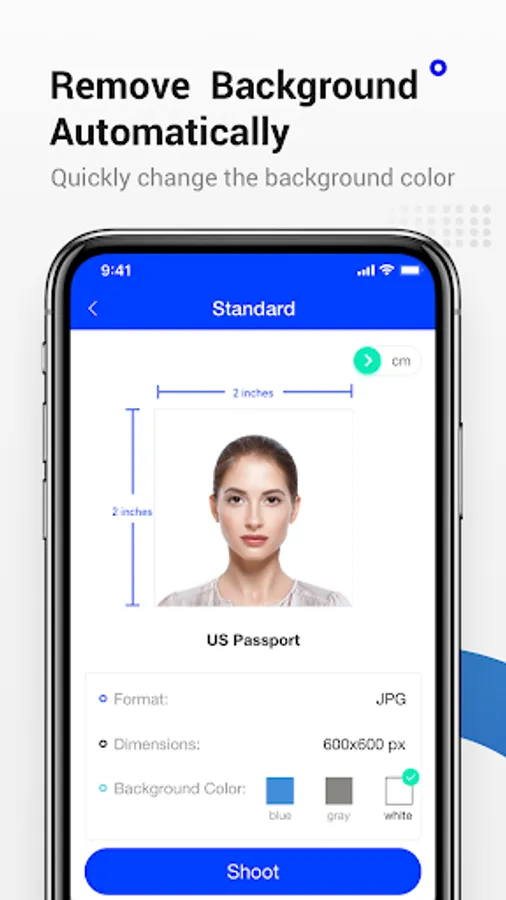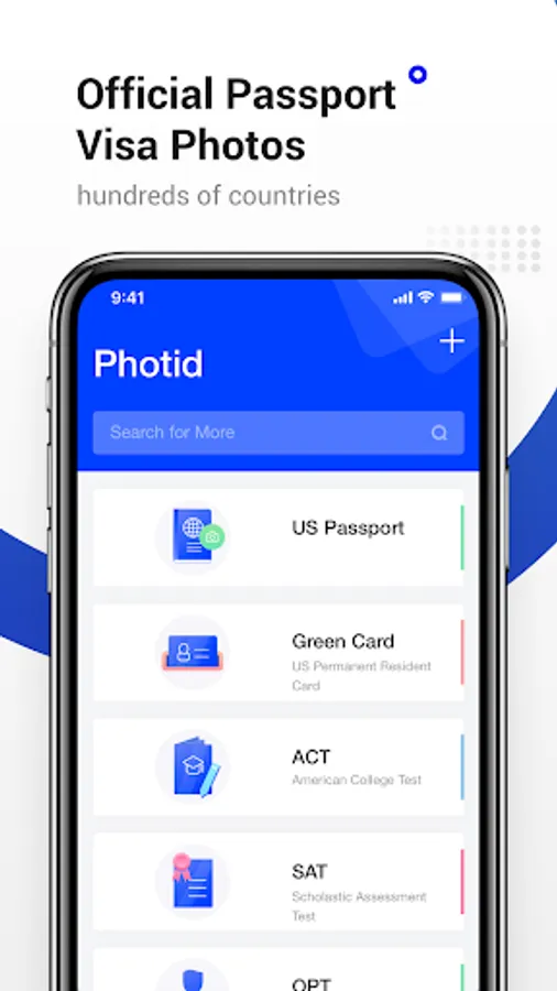 Passport/Visa photos can be taken from the camera or uploaded from album. It provides passport photo templates for over 100 countries.