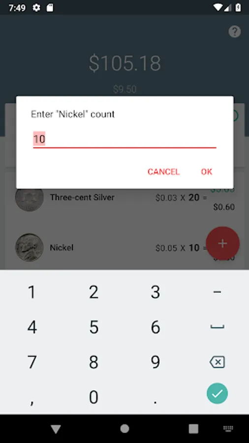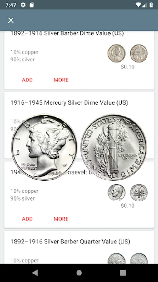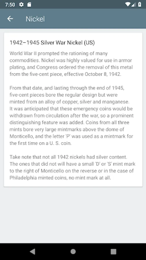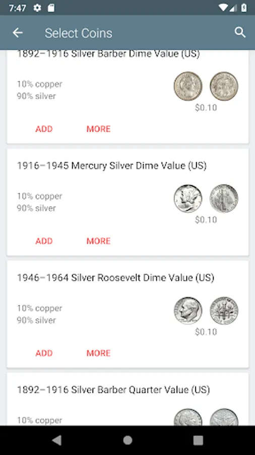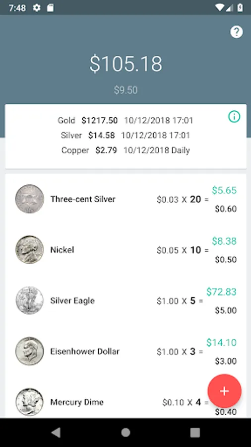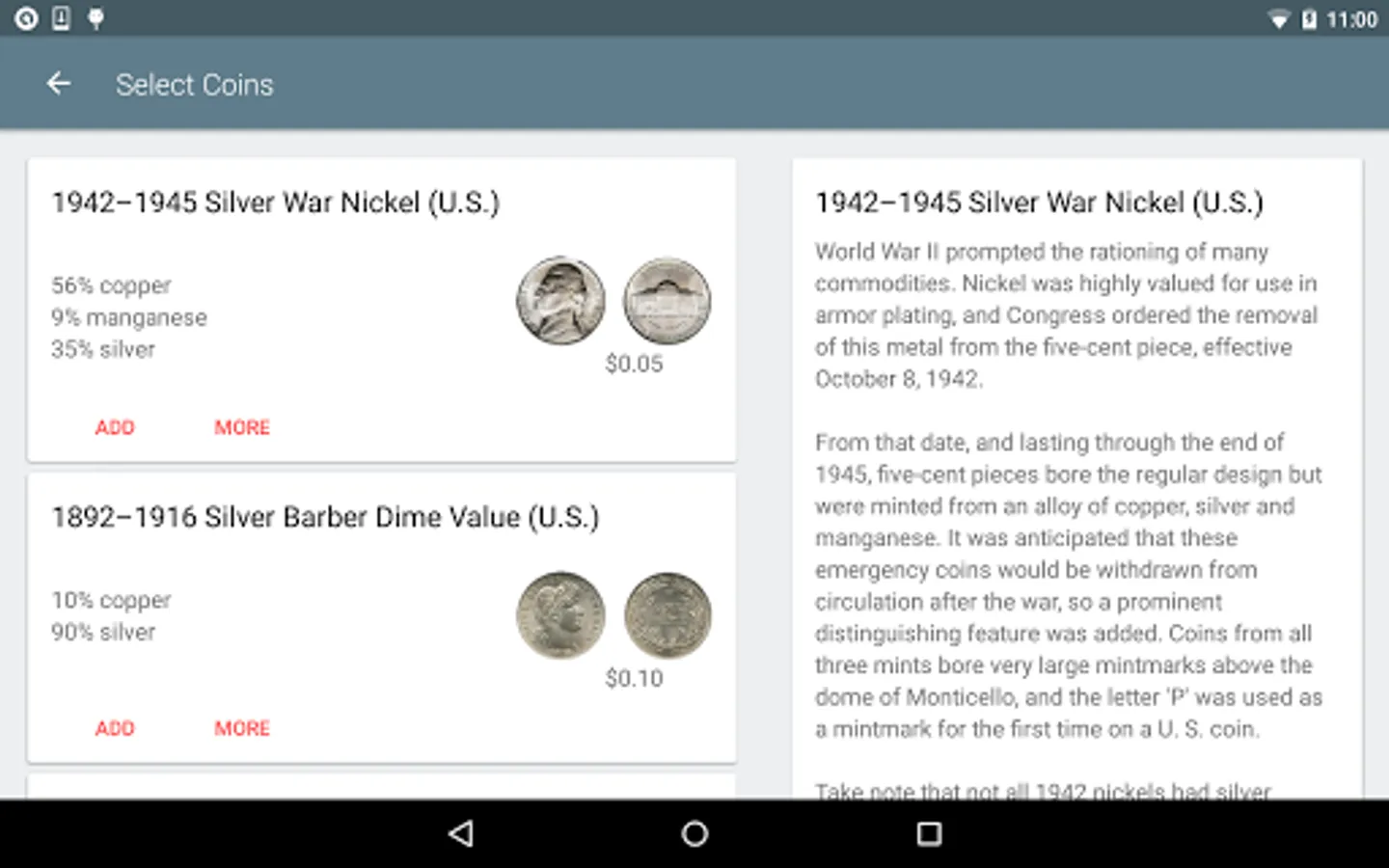 The app is a virtual wallet where user can select the silver coins and quantities and see the total real value based on metal content. The nominal value is shown as well.